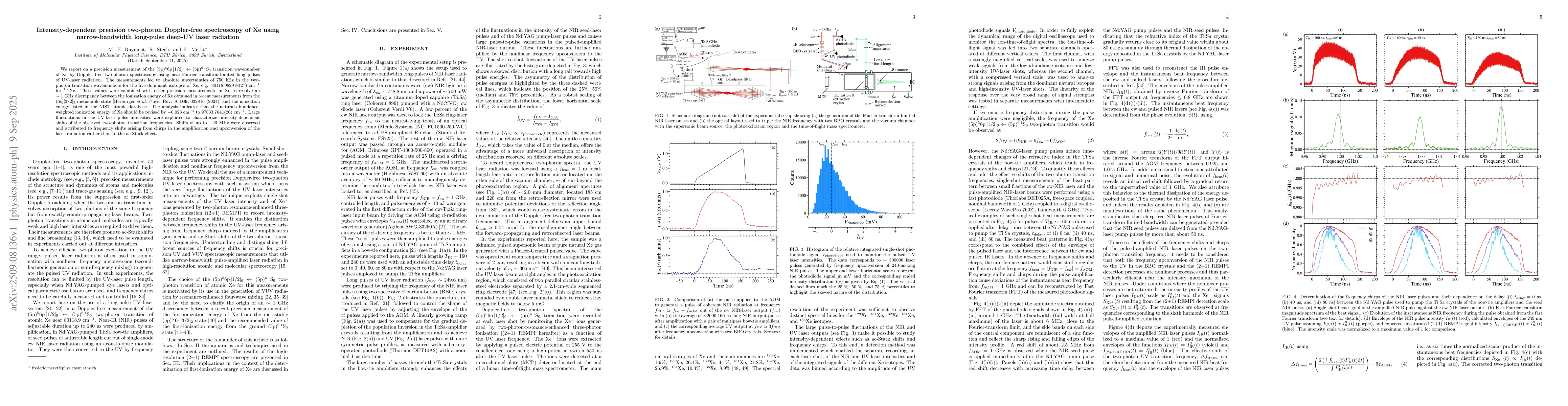 We report on a precision measurement of the $(5\mathrm{p})^{5}6\mathrm{p} \, [1/2]_{0}\leftarrow (5\mathrm{p})^{6} \, ^{1}\mathrm{S}_{0}$ transition wavenumber of Xe by Doppler-free two-photon spectroscopy using near-Fourier-transform-limited long pulses of UV-laser radiation. The measurements led to absolute uncertainties of 750~kHz in the two-photon transition wavenumbers for the five dominant isotopes of Xe, e.g., 80118.982918(27)~cm$^{-1}$ for $^{136}$Xe. These values were combined with other precision measurements in Xe to resolve an $\sim1~\mathrm{GHz}$ discrepancy between the ionization energy of Xe obtained in recent measurements from the $(6{\rm s})[3/2]_2$ metastable state [Herburger {\it et al.} Phys. Rev. A {\bf 109}, 032816 (2024)] and the ionization energy listed in the NIST atomic database. The analysis indicates that the natural-abundance-weighted ionization energy of Xe should be revised by $-0.023$~cm$^{-1}$ to 97833.7641(20)~cm$^{-1}$. Large fluctuations in the UV-laser pulse intensities were exploited to characterize intensity-dependent shifts of the observed two-photon transition frequencies. Shifts of up to $- 20~\mathrm{MHz}$ were observed and attributed to frequency shifts arising from chirps in the amplification and upconversion of the laser radiation rather than to the ac-Stark effect.
