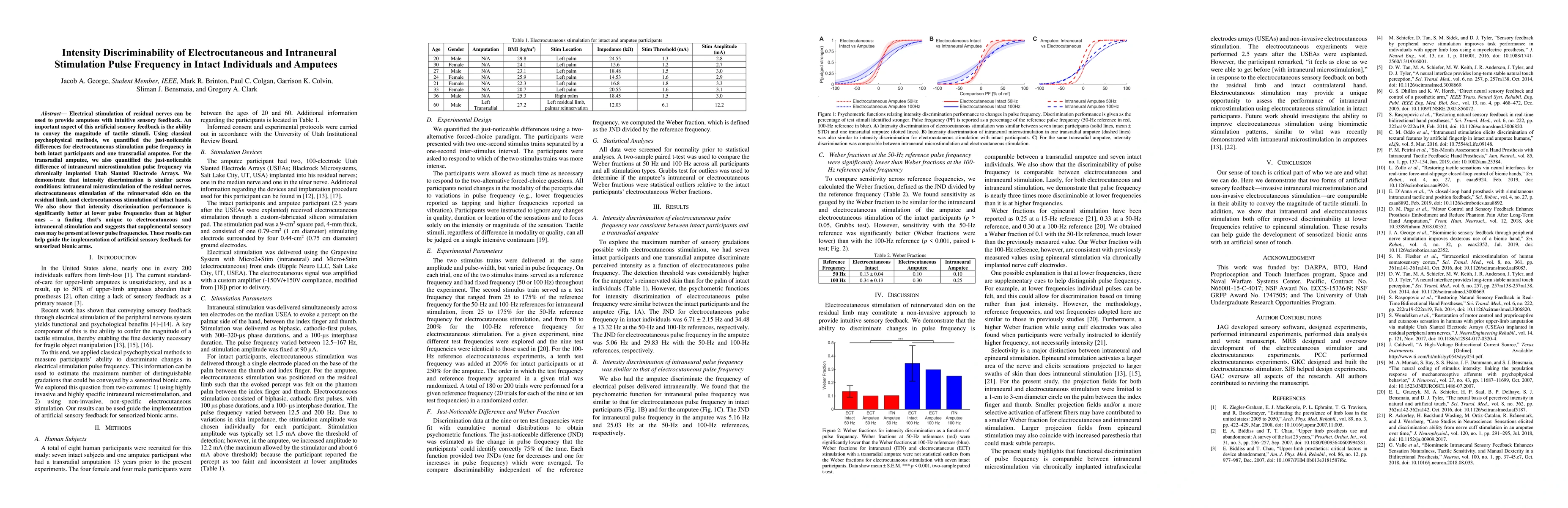 This study investigates the intensity discriminability of electrocutaneous and intraneural stimulation pulse frequency in intact individuals and transradial amputees, finding similar discrimination across stimulation types and better performance at lower frequencies, which may enhance sensorized bionic arm feedback.