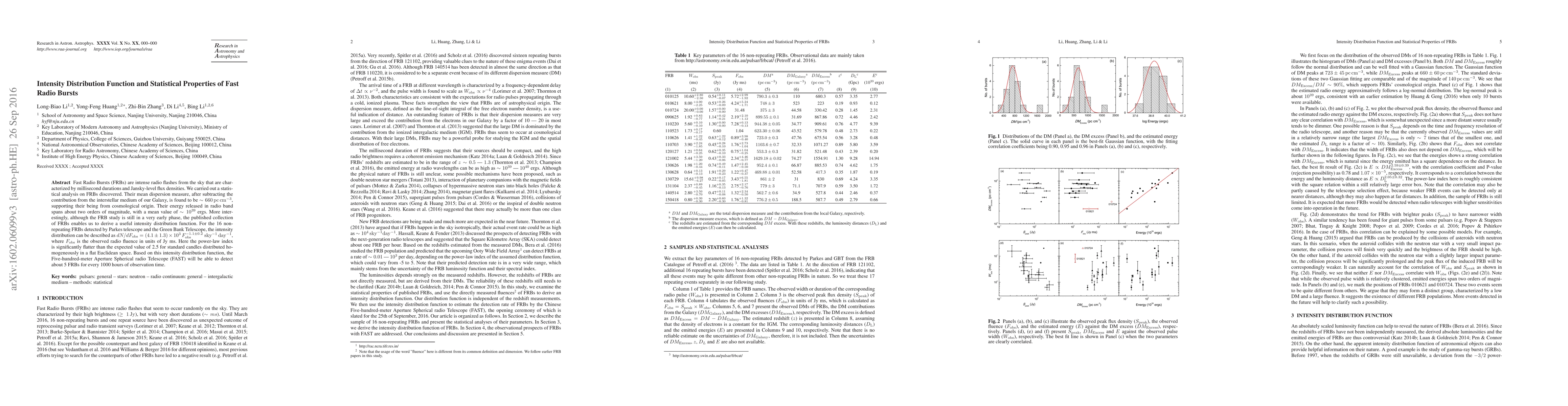 This paper investigates the statistical properties of Fast Radio Bursts (FRBs), finding a mean dispersion measure of $\sim 660\,\rm pc\,cm^{-3}$ and a mean energy release of $\sim 10^{39}$ ergs. It derives an intensity distribution function for 16 non-repeating FRBs, revealing a flatter power-law index than expected, and predicts that FAST will detect about 5 FRBs per 1000 hours of observation.