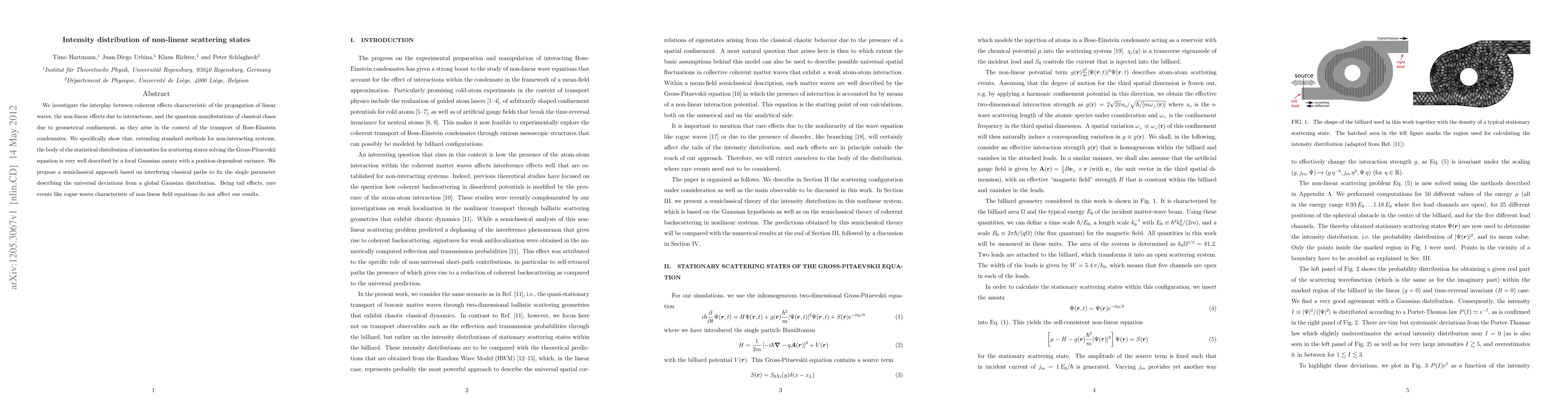 We investigate the interplay between coherent effects characteristic of the propagation of linear waves, the non-linear effects due to interactions, and the quantum manifestations of classical chaos due to geometrical confinement, as they arise in the context of the transport of Bose-Einstein condensates. We specifically show that, extending standard methods for non-interacting systems, the body of the statistical distribution of intensities for scattering states solving the Gross-Pitaevskii equation is very well described by a local Gaussian ansatz with a position-dependent variance. We propose a semiclassical approach based on interfering classical paths to fix the single parameter describing the universal deviations from a global Gaussian distribution. Being tail effects, rare events like rogue waves characteristic of non-linear field equations do not affect our results.