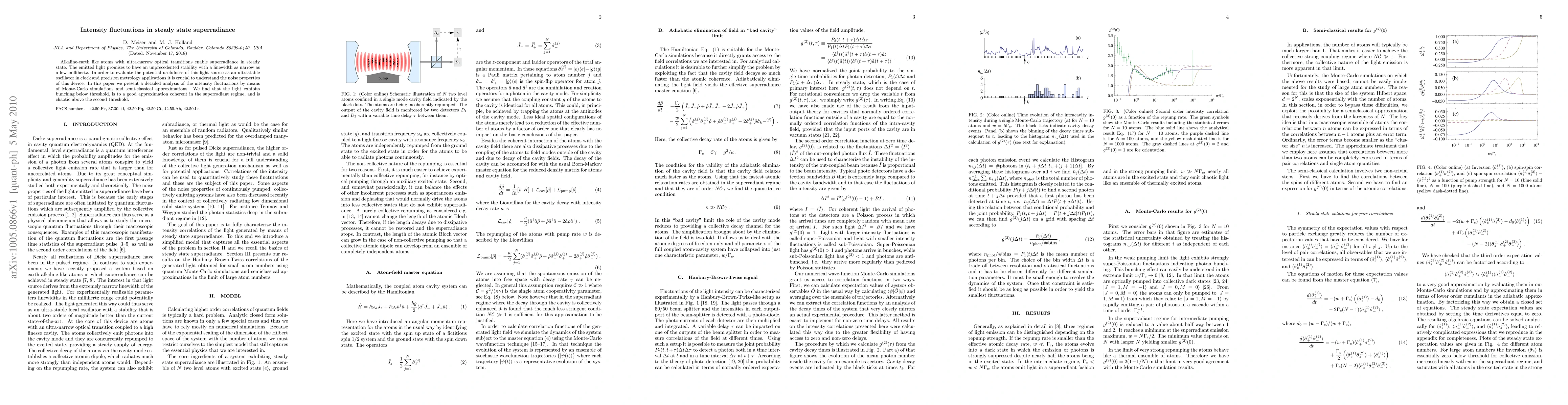 This paper investigates the intensity fluctuations of light emitted during steady state superradiance from alkaline-earth atoms, using Monte-Carlo simulations and semi-classical approximations. The findings reveal that the light exhibits bunching below threshold, coherence in the superradiant regime, and chaotic behavior above the second threshold.