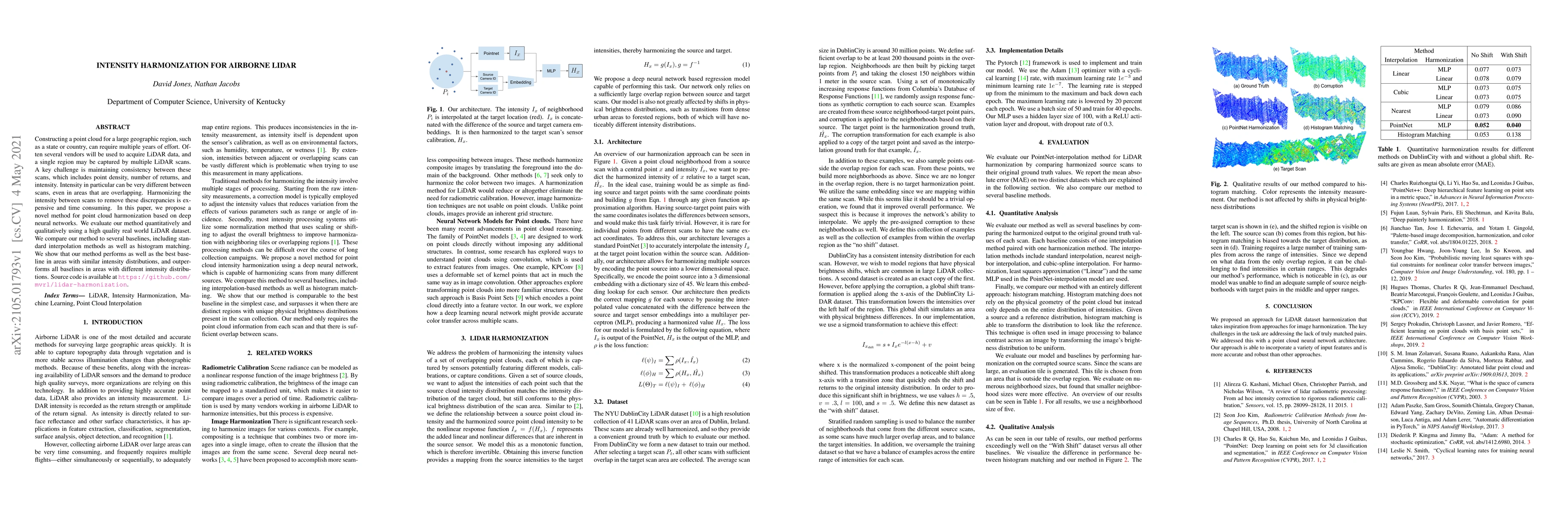 This paper proposes a novel deep neural network method for harmonizing intensity discrepancies in airborne LiDAR point clouds, addressing the challenge of maintaining consistency across multiple LiDAR scans from different vendors. The method is shown to outperform standard interpolation and histogram matching techniques, especially in areas with differing intensity distributions.