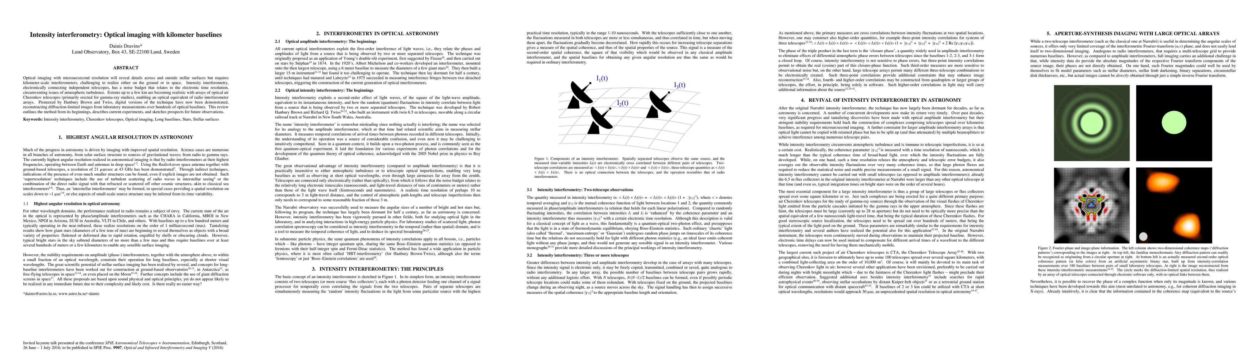 This paper reviews intensity interferometry, a method that electronically connects independent telescopes to achieve microarcsecond resolution optical imaging using kilometer baselines. It discusses the technique's historical development, current experiments, and future prospects for astronomical observations, leveraging arrays of optical air Cherenkov telescopes.