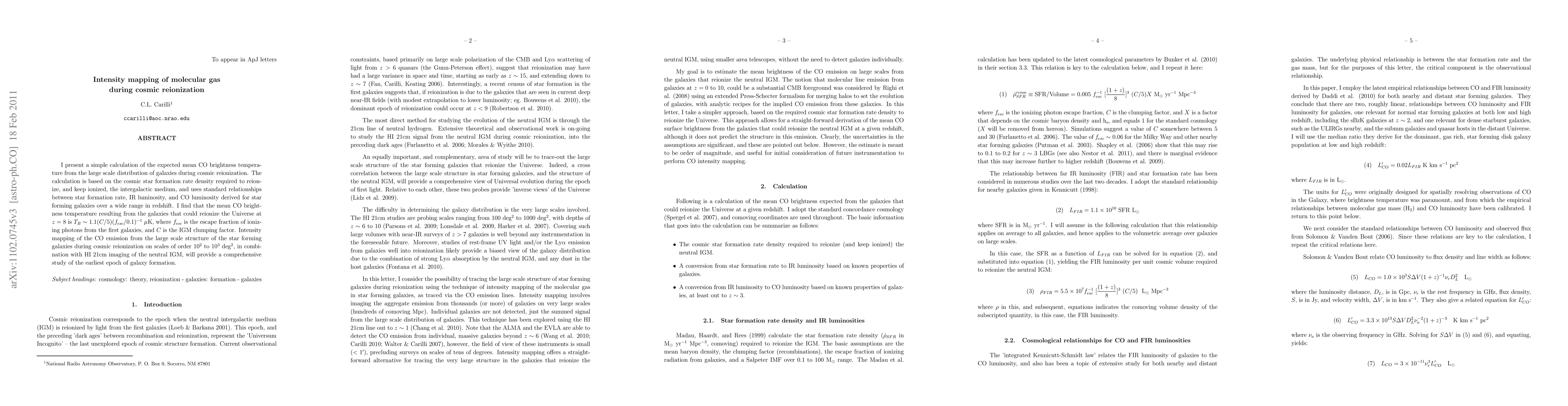 This paper calculates the expected mean CO brightness temperature from galaxies during cosmic reionization, finding it to be $T_B \sim 1.1 (C/5) (f_{esc}/0.1)^{-1} \mu$K. It suggests that intensity mapping of CO emission combined with HI 21cm imaging can study early galaxy formation.