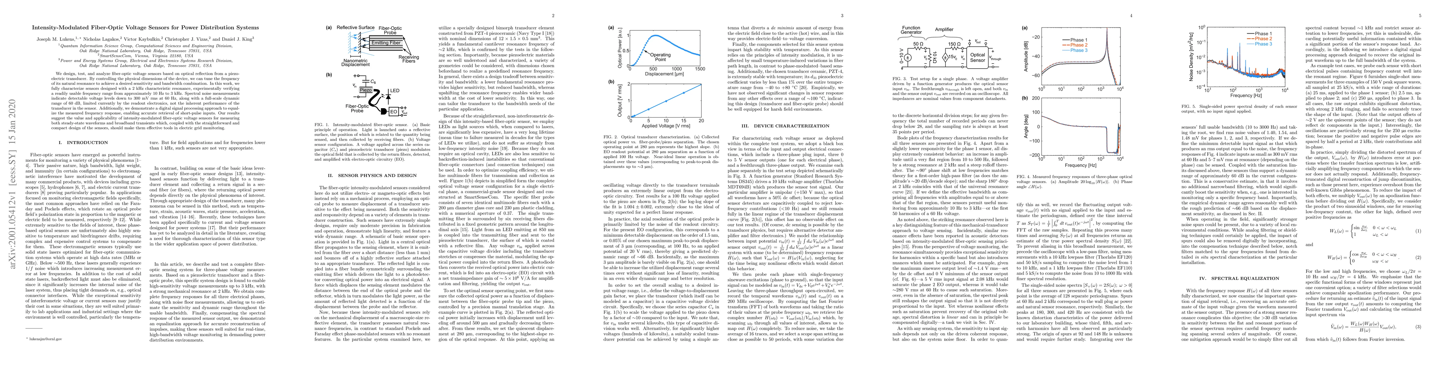 We design, test, and analyze fiber-optic voltage sensors based on optical reflection from a piezoelectric transducer. By controlling the physical dimensions of the device, we can tune the frequency of its natural resonance to achieve a desired sensitivity and bandwidth combination. In this work, we fully characterize sensors designed with a 2 kHz characteristic resonance, experimentally verifying a readily usable frequency range from approximately 10 Hz to 3 kHz. Spectral noise measurements indicate detectable voltage levels down to 300 mV rms at 60 Hz, along with a full-scale dynamic range of 60 dB, limited currently by the readout electronics, not the inherent performance of the transducer in the sensor. Additionally, we demonstrate a digital signal processing approach to equalize the measured frequency response, enabling accurate retrieval of short-pulse inputs. Our results suggest the value and applicability of intensity-modulated fiber-optic voltage sensors for measuring both steady-state waveforms and broadband transients which, coupled with the straightforward and compact design of the sensors, should make them effective tools in electric grid monitoring.