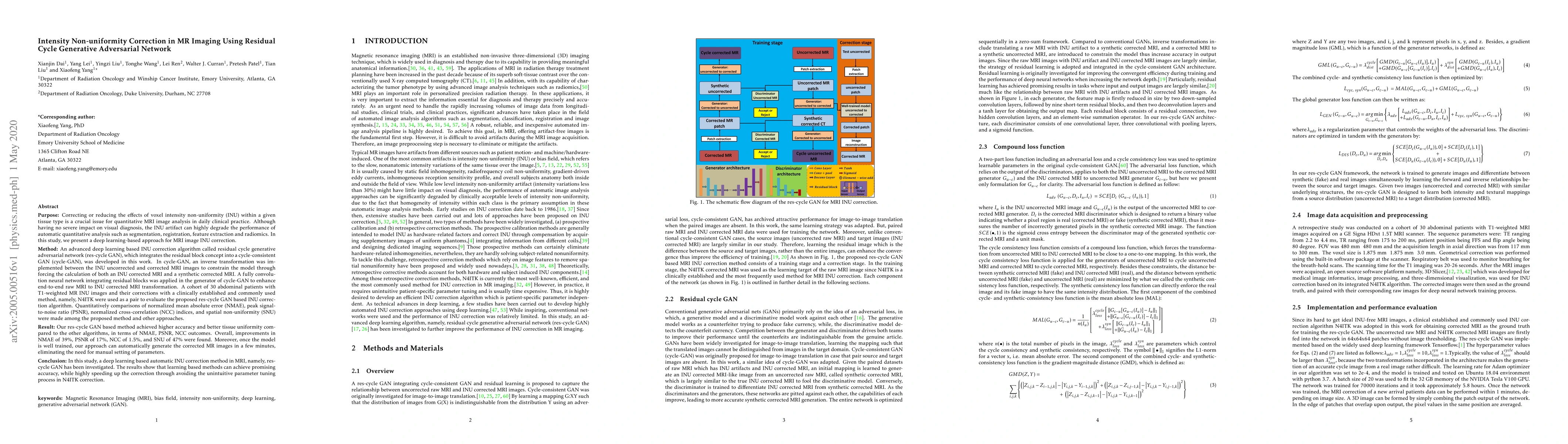 Purpose: Correcting or reducing the effects of voxel intensity non-uniformity (INU) within a given tissue type is a crucial issue for quantitative MRI image analysis in daily clinical practice. In this study, we present a deep learning-based approach for MRI image INU correction. Method: We developed a residual cycle generative adversarial network (res-cycle GAN), which integrates the residual block concept into a cycle-consistent GAN (cycle-GAN). In cycle-GAN, an inverse transformation was implemented between the INU uncorrected and corrected MRI images to constrain the model through forcing the calculation of both an INU corrected MRI and a synthetic corrected MRI. A fully convolution neural network integrating residual blocks was applied in the generator of cycle-GAN to enhance end-to-end raw MRI to INU corrected MRI transformation. A cohort of 30 abdominal patients with T1-weighted MR INU images and their corrections with a clinically established and commonly used method, namely, N4ITK were used as a pair to evaluate the proposed res-cycle GAN based INU correction algorithm. Quantitatively comparisons were made among the proposed method and other approaches. Result: Our res-cycle GAN based method achieved higher accuracy and better tissue uniformity compared to the other algorithms. Moreover, once the model is well trained, our approach can automatically generate the corrected MR images in a few minutes, eliminating the need for manual setting of parameters. Conclusion: In this study, a deep learning based automatic INU correction method in MRI, namely, res-cycle GAN has been investigated. The results show that learning based methods can achieve promising accuracy, while highly speeding up the correction through avoiding the unintuitive parameter tuning process in N4ITK correction.