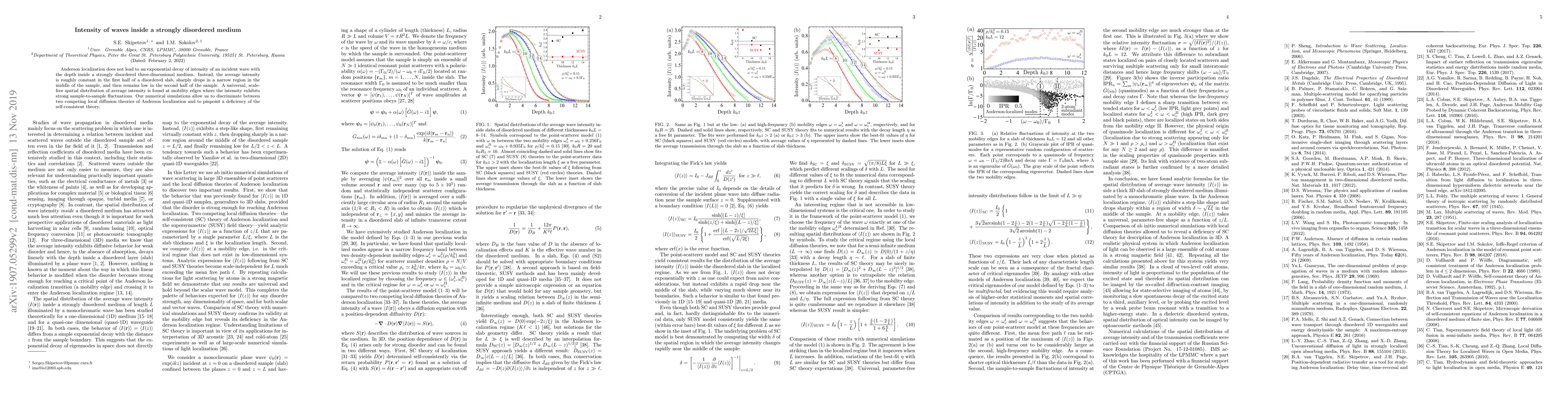 Anderson localization does not lead to an exponential decay of intensity of an incident wave with the depth inside a strongly disordered three-dimensional medium. Instead, the average intensity is roughly constant in the first half of a disordered slab, sharply drops in a narrow region in the middle of the sample, and then remains low in the second half of the sample. A universal, scale-free spatial distribution of average intensity is found at mobility edges where the intensity exhibits strong sample-to-sample fluctuations. Our numerical simulations allow us to discriminate between two competing local diffusion theories of Anderson localization and to pinpoint a deficiency of the self-consistent theory.