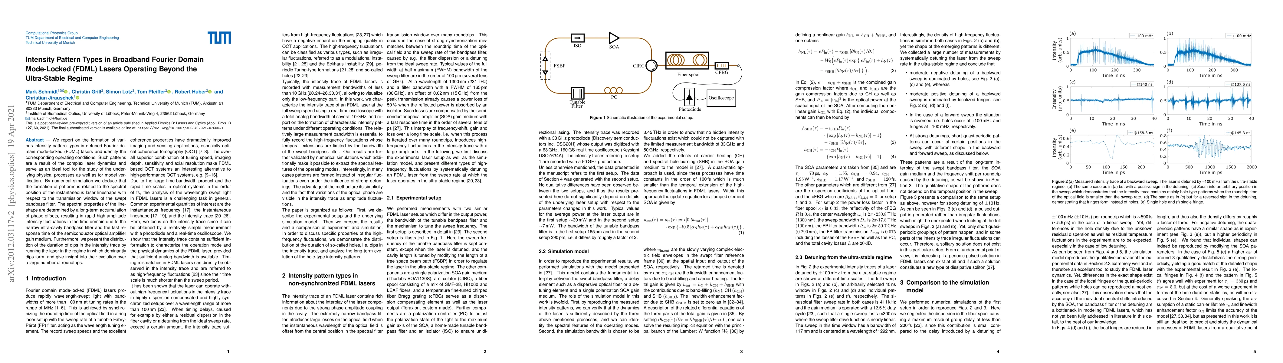 We report on the formation of various intensity pattern types in detuned Fourier domain mode-locked (FDML) lasers and identify the corresponding operating conditions. Such patterns are a result of the complex laser dynamics and serve as an ideal tool for the study of the underlying physical processes as well as for model verification. By numerical simulation we deduce that the formation of patterns is related to the spectral position of the instantaneous laser lineshape with respect to the transmission window of the swept bandpass filter. The spectral properties of the lineshape are determined by a long-term accumulation of phase-offsets, resulting in rapid high-amplitude intensity fluctuations in the time domain due to the narrow intra-cavity bandpass filter and the fast response time of the semiconductor optical amplifier gain medium. Furthermore, we present the distribution of the duration of dips in the intensity trace by running the laser in the regime in which dominantly dips form, and give insight into their evolution over a large number of roundtrips.