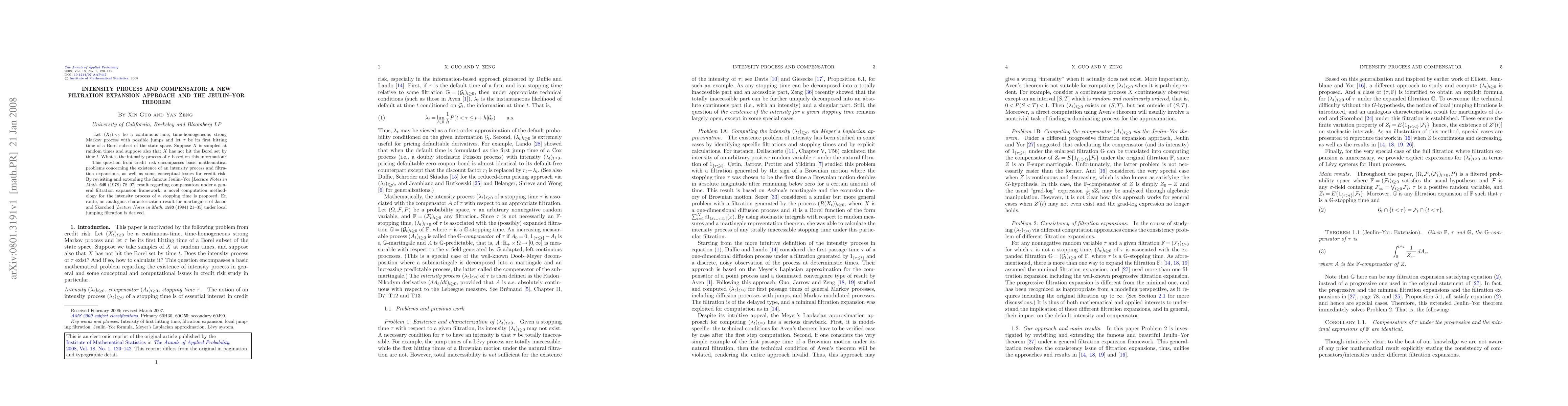 Let $(X_t)_{t\ge0}$ be a continuous-time, time-homogeneous strong Markov process with possible jumps and let $\tau$ be its first hitting time of a Borel subset of the state space. Suppose $X$ is sampled at random times and suppose also that $X$ has not hit the Borel set by time $t$. What is the intensity process of $\tau$ based on this information? This question from credit risk encompasses basic mathematical problems concerning the existence of an intensity process and filtration expansions, as well as some conceptual issues for credit risk. By revisiting and extending the famous Jeulin--Yor [Lecture Notes in Math. 649 (1978) 78--97] result regarding compensators under a general filtration expansion framework, a novel computation methodology for the intensity process of a stopping time is proposed. En route, an analogous characterization result for martingales of Jacod and Skorohod [Lecture Notes in Math. 1583 (1994) 21--35] under local jumping filtration is derived.