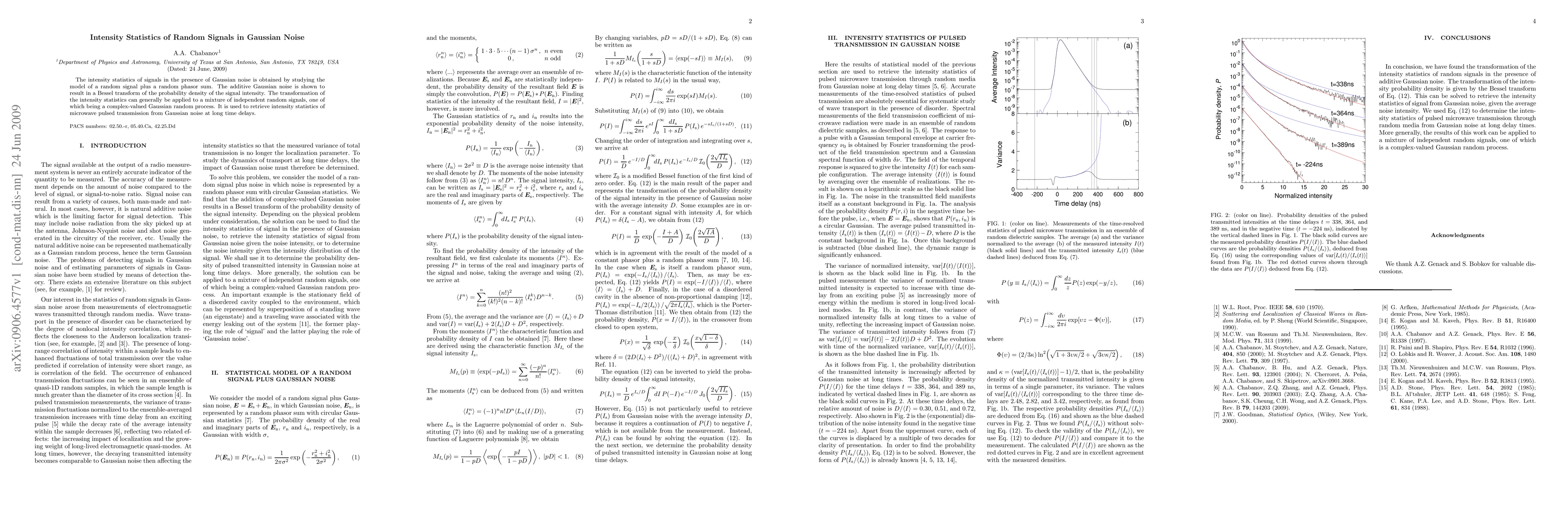 This paper investigates the intensity statistics of random signals in the presence of Gaussian noise, revealing a Bessel transform of the signal intensity probability density. The findings are applied to retrieve the intensity statistics of microwave pulsed transmission from noise at long time delays.