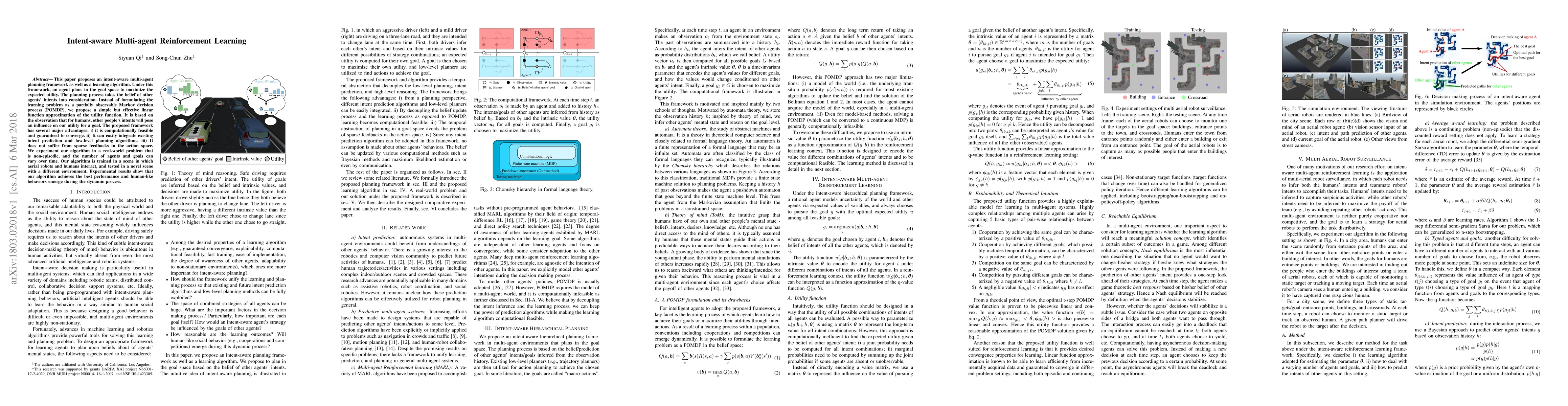 This paper proposes an intent-aware multi-agent planning framework as well as a learning algorithm. Under this framework, an agent plans in the goal space to maximize the expected utility. The planning process takes the belief of other agents' intents into consideration. Instead of formulating the learning problem as a partially observable Markov decision process (POMDP), we propose a simple but effective linear function approximation of the utility function. It is based on the observation that for humans, other people's intents will pose an influence on our utility for a goal. The proposed framework has several major advantages: i) it is computationally feasible and guaranteed to converge. ii) It can easily integrate existing intent prediction and low-level planning algorithms. iii) It does not suffer from sparse feedbacks in the action space. We experiment our algorithm in a real-world problem that is non-episodic, and the number of agents and goals can vary over time. Our algorithm is trained in a scene in which aerial robots and humans interact, and tested in a novel scene with a different environment. Experimental results show that our algorithm achieves the best performance and human-like behaviors emerge during the dynamic process.