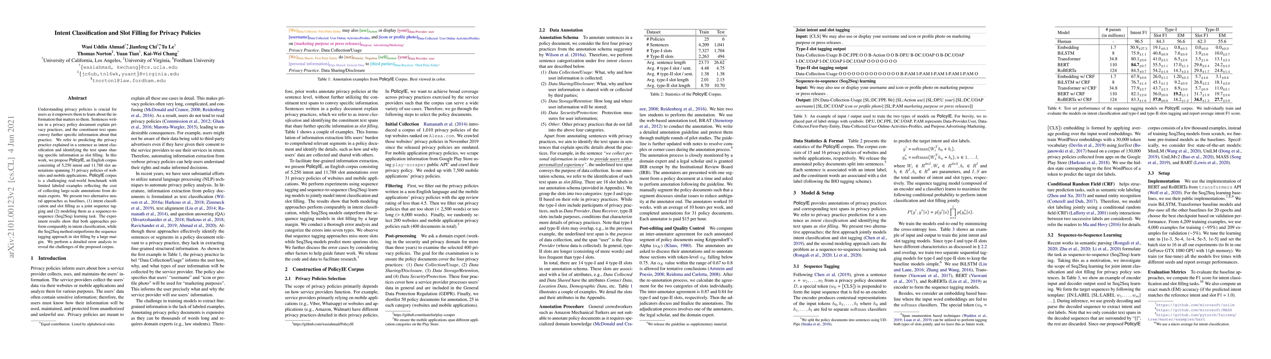 This paper introduces PolicyIE, a corpus for intent classification and slot filling in privacy policy documents, and proposes two neural network approaches for these tasks. The Seq2Seq method outperforms the joint sequence tagging approach in slot filling, highlighting the challenges in the newly created dataset.