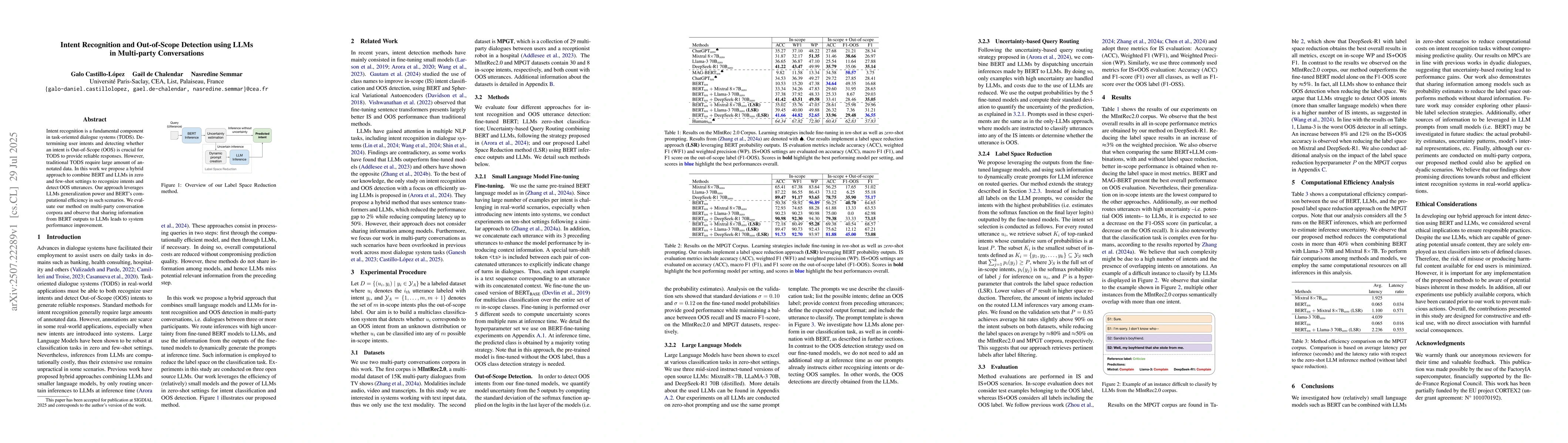 Intent recognition is a fundamental component in task-oriented dialogue systems (TODS). Determining user intents and detecting whether an intent is Out-of-Scope (OOS) is crucial for TODS to provide reliable responses. However, traditional TODS require large amount of annotated data. In this work we propose a hybrid approach to combine BERT and LLMs in zero and few-shot settings to recognize intents and detect OOS utterances. Our approach leverages LLMs generalization power and BERT's computational efficiency in such scenarios. We evaluate our method on multi-party conversation corpora and observe that sharing information from BERT outputs to LLMs leads to system performance improvement.