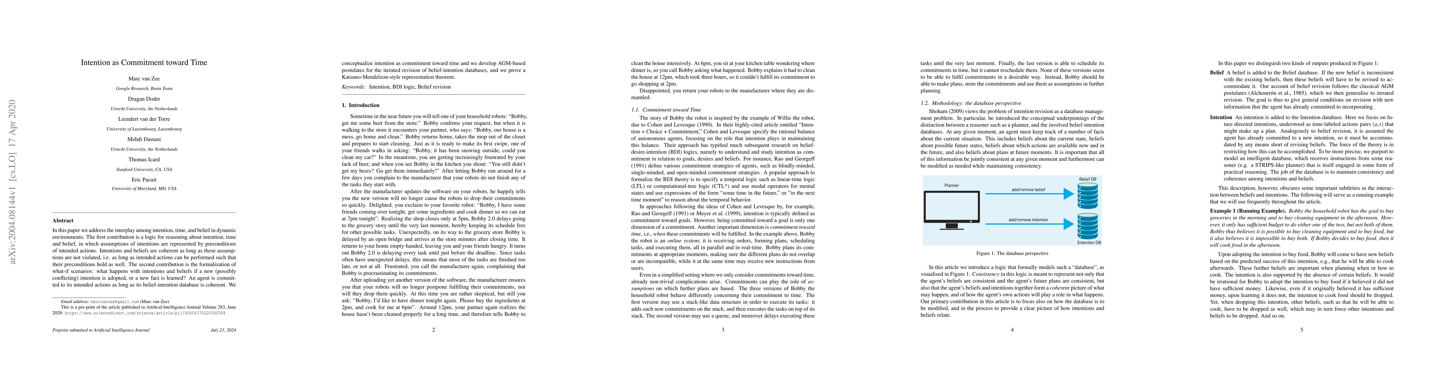 In this paper we address the interplay among intention, time, and belief in dynamic environments. The first contribution is a logic for reasoning about intention, time and belief, in which assumptions of intentions are represented by preconditions of intended actions. Intentions and beliefs are coherent as long as these assumptions are not violated, i.e. as long as intended actions can be performed such that their preconditions hold as well. The second contribution is the formalization of what-if scenarios: what happens with intentions and beliefs if a new (possibly conflicting) intention is adopted, or a new fact is learned? An agent is committed to its intended actions as long as its belief-intention database is coherent. We conceptualize intention as commitment toward time and we develop AGM-based postulates for the iterated revision of belief-intention databases, and we prove a Katsuno-Mendelzon-style representation theorem.