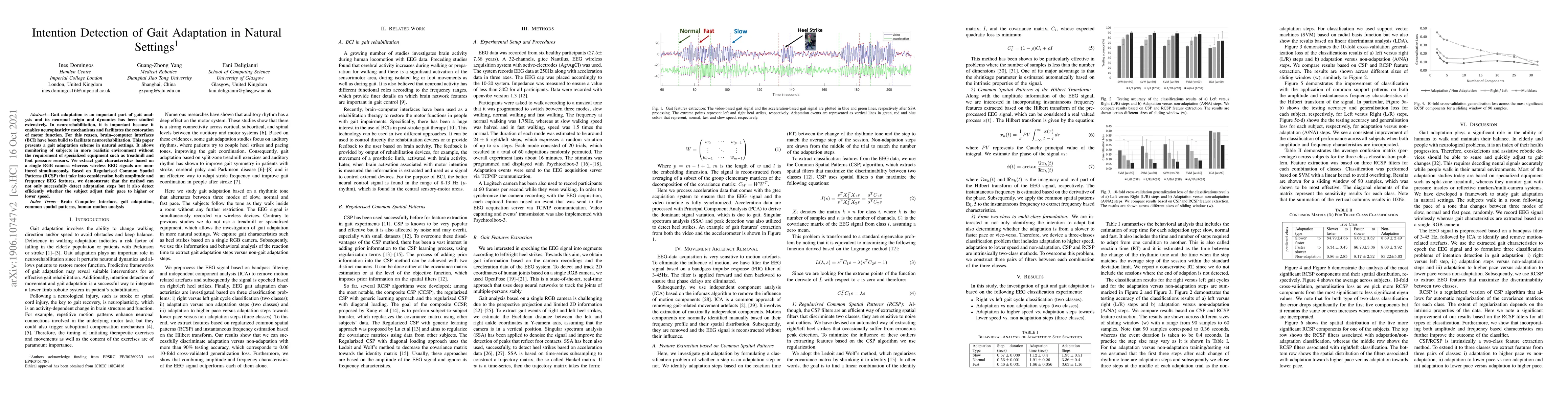 Gait adaptation is an important part of gait analysis and its neuronal origin and dynamics has been studied extensively. In neurorehabilitation, it is important as it perturbs neuronal dynamics and allows patients to restore some of their motor function. Exoskeletons and robotics of the lower limbs are increasingly used to facilitate rehabilitation as well as supporting daily function. Their efficiency and safety depends on how well can sense the human intention to move and adapt the gait accordingly. This paper presents a gait adaptation scheme in natural settings. It allows monitoring of subjects in more realistic environment without the requirement of specialized equipment such as treadmill and foot pressure sensors. We extract gait characteristics based on a single RBG camera whereas wireless EEG signals are monitored simultaneously. We demonstrate that the method can not only successfully detect adaptation steps but also detect efficiently whether the subject adjust their pace to higher or lower speed.