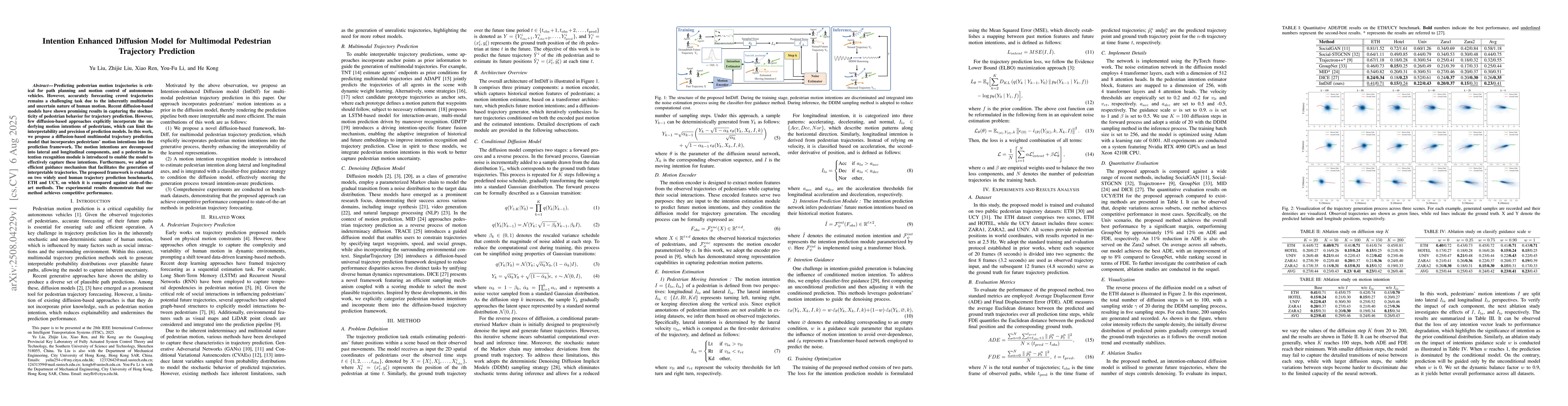 Predicting pedestrian motion trajectories is critical for path planning and motion control of autonomous vehicles. However, accurately forecasting crowd trajectories remains a challenging task due to the inherently multimodal and uncertain nature of human motion. Recent diffusion-based models have shown promising results in capturing the stochasticity of pedestrian behavior for trajectory prediction. However, few diffusion-based approaches explicitly incorporate the underlying motion intentions of pedestrians, which can limit the interpretability and precision of prediction models. In this work, we propose a diffusion-based multimodal trajectory prediction model that incorporates pedestrians' motion intentions into the prediction framework. The motion intentions are decomposed into lateral and longitudinal components, and a pedestrian intention recognition module is introduced to enable the model to effectively capture these intentions. Furthermore, we adopt an efficient guidance mechanism that facilitates the generation of interpretable trajectories. The proposed framework is evaluated on two widely used human trajectory prediction benchmarks, ETH and UCY, on which it is compared against state-of-the-art methods. The experimental results demonstrate that our method achieves competitive performance.