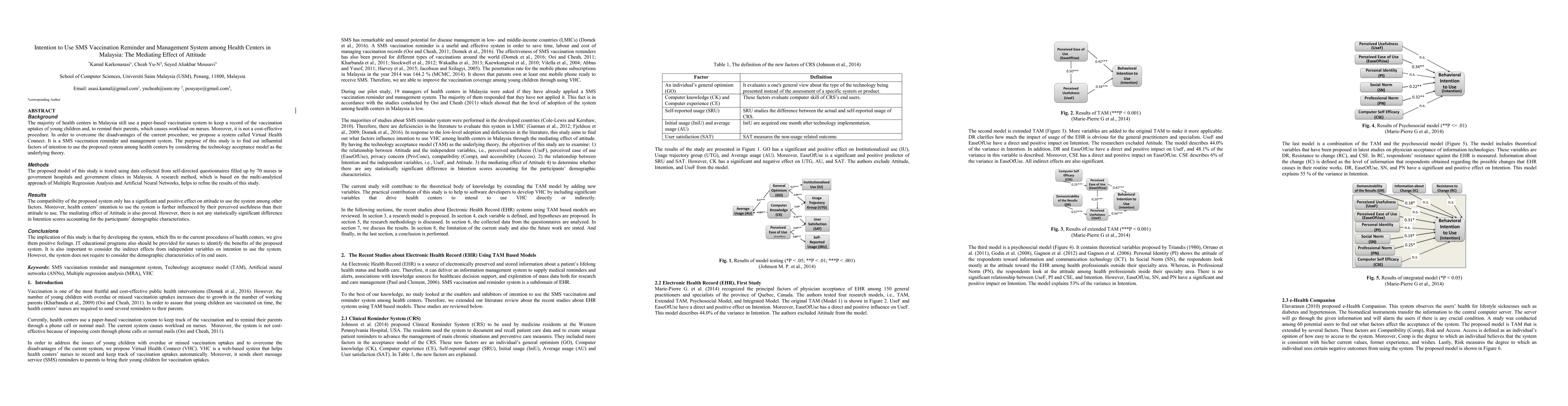 This study investigates factors influencing the intention to use an SMS vaccination reminder system in Malaysian health centers, using the technology acceptance model. Results show that system compatibility significantly affects attitude, which in turn mediates the relationship between perceived usefulness and intention to use, with no significant demographic differences. Implications suggest focusing on system compatibility and IT education for nurses.