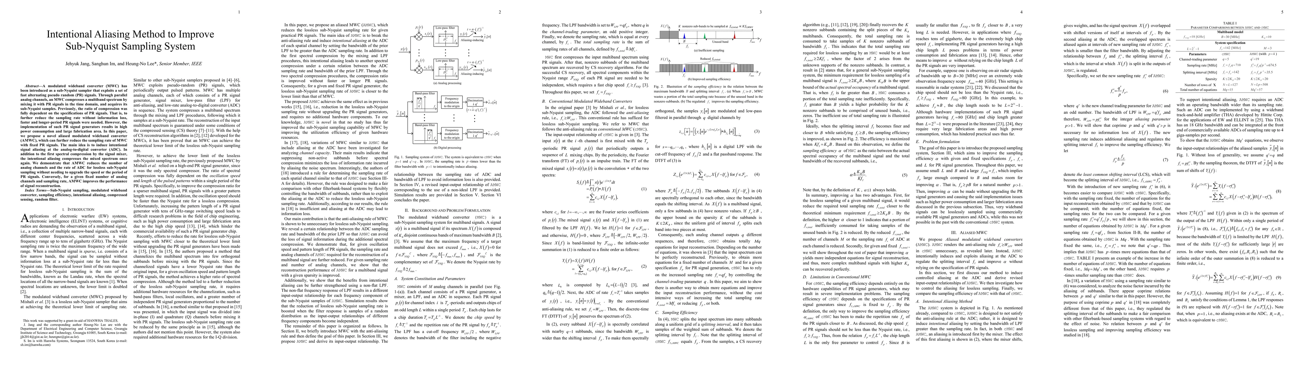 This paper introduces an aliased modulated wideband converter (AMWC) to improve sub-Nyquist sampling systems by intentionally inducing aliasing at the ADC, thereby reducing the sampling rate without information loss and minimizing the need for high-speed, long-period pseudo-random signals. This method lowers power consumption and fabrication area compared to traditional methods.