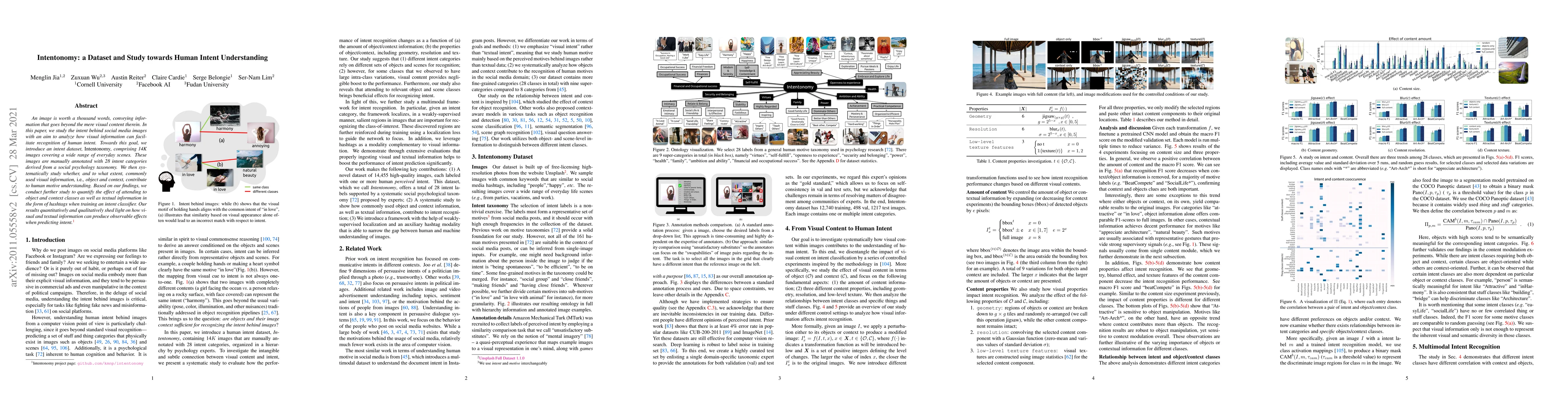 This research paper introduces a dataset called Intentonomy to study human intent understanding from social media images, exploring how visual information contributes to recognizing human motives. The study finds that both object and context features, as well as textual information, can improve intent prediction accuracy.