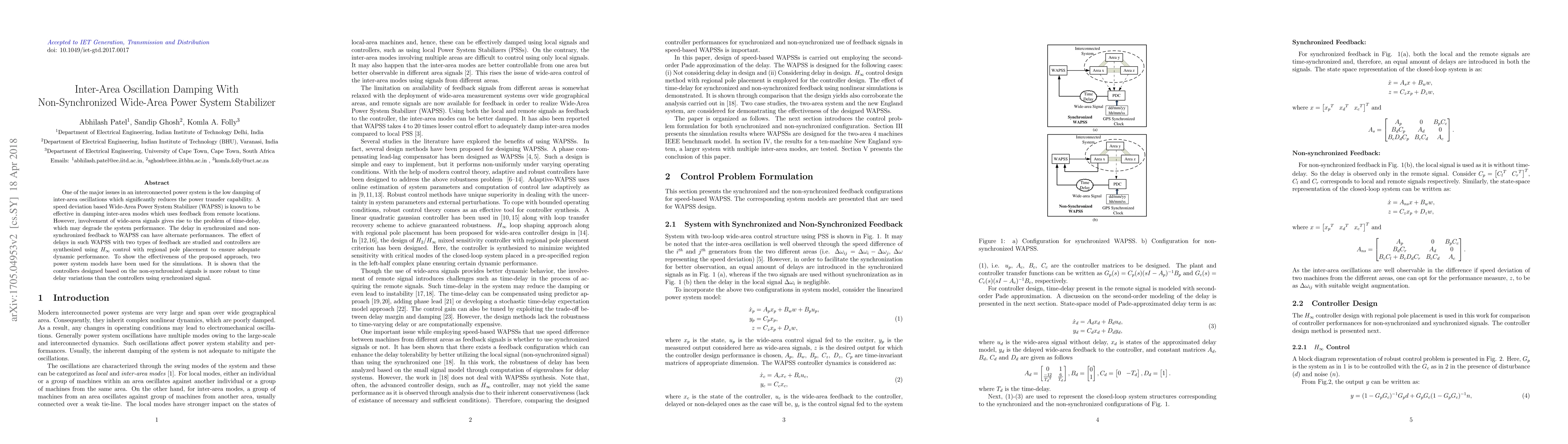 One of the major issues in an interconnected power system is the low damping of inter-area oscillations which significantly reduces the power transfer capability. Advances in Wide-Area Measurement System (WAMS) makes it possible to use the information from geographical distant location to improve power system dynamics and performances. A speed deviation based Wide-Area Power System Stabilizer (WAPSS) is known to be effective in damping inter-area modes. However, the involvement of wide-area signals gives rise to the problem of time-delay, which may degrade the system performance. In general, time-stamped synchronized signals from Phasor Data Concentrator (PDC) are used for WAPSS, in which delays are introduced in both local and remote signals. One can opt for a feedback of remote signal only from PDC and uses the local signal as it is available, without time synchronization. This paper utilizes configurations of time-matched synchronized and nonsychronized feedback and provides the guidelines to design the controller. The controllers are synthesized using $H_\infty$ control with regional pole placement for ensuring adequate dynamic performance. To show the effectiveness of the proposed approach, two power system models have been used for the simulations. It is shown that the controllers designed based on the nonsynchronized signals are more robust to time time delay variations than the controllers using synchronized signal.