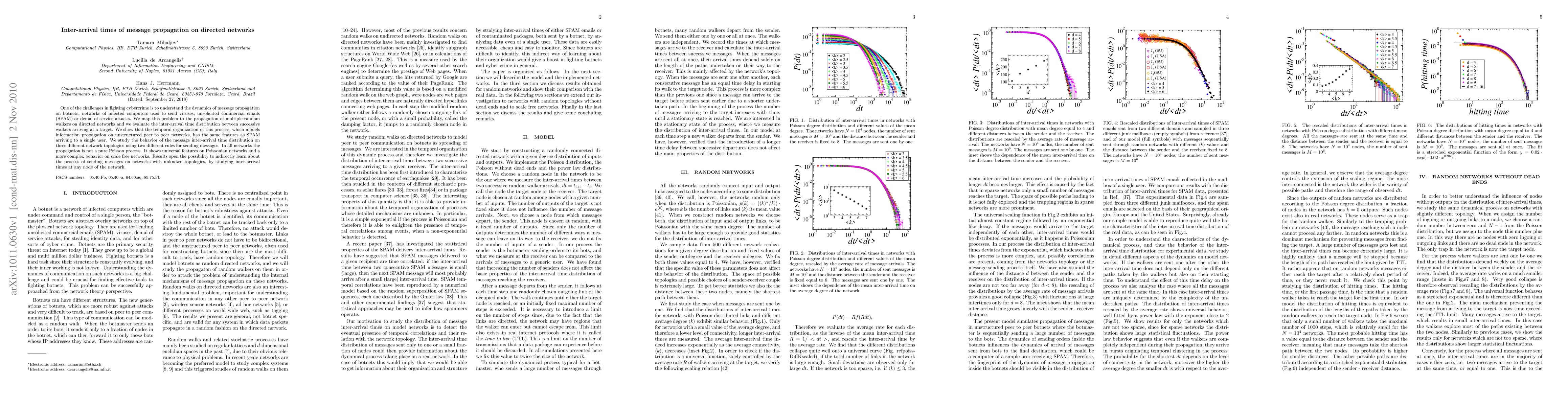 One of the challenges in fighting cybercrime is to understand the dynamics of message propagation on botnets, networks of infected computers used to send viruses, unsolicited commercial emails (SPAM) or denial of service attacks. We map this problem to the propagation of multiple random walkers on directed networks and we evaluate the inter-arrival time distribution between successive walkers arriving at a target. We show that the temporal organization of this process, which models information propagation on unstructured peer to peer networks, has the same features as SPAM arriving to a single user. We study the behavior of the message inter-arrival time distribution on three different network topologies using two different rules for sending messages. In all networks the propagation is not a pure Poisson process. It shows universal features on Poissonian networks and a more complex behavior on scale free networks. Results open the possibility to indirectly learn about the process of sending messages on networks with unknown topologies, by studying inter-arrival times at any node of the network.
