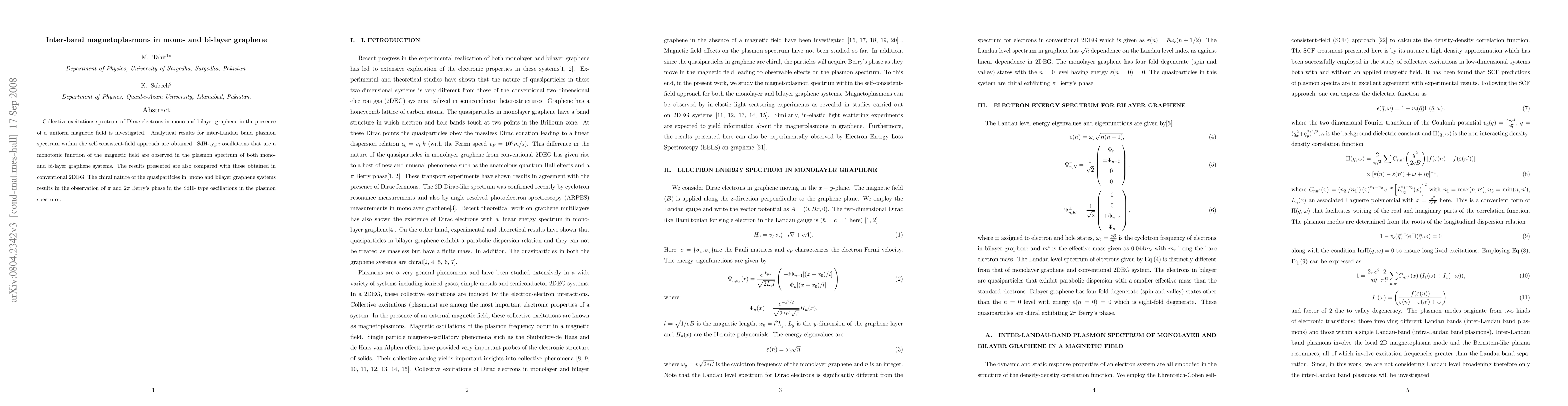 This study investigates the collective excitations of Dirac electrons in mono- and bi-layer graphene under a magnetic field, revealing inter-Landau band plasmon spectra with SdH-type oscillations. The findings highlight unique $\pi$ and $2\pi$ Berry's phase effects due to the chiral nature of quasiparticles in graphene.