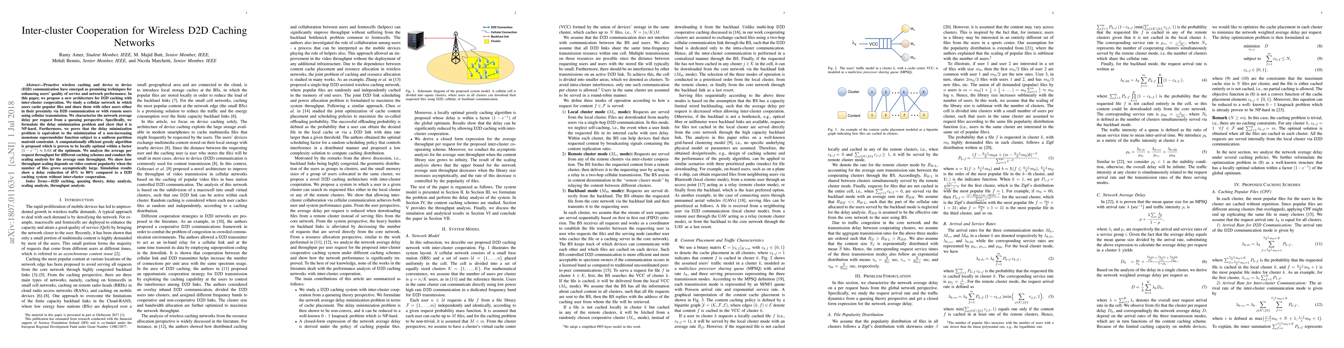 Proactive wireless caching and device to device (D2D) communication have emerged as promising techniques for enhancing users' quality of service and network performance. In this paper, we propose a new architecture for D2D caching with inter-cluster cooperation. We study a cellular network in which users cache popular files and share them with other users either in their proximity via D2D communication or with remote users using cellular transmission. We characterize the network average delay per request from a queuing perspective. Specifically, we formulate the delay minimization problem and show that it is NP-hard. Furthermore, we prove that the delay minimization problem is equivalent to the minimization of a non-increasing monotone supermodular function subject to a uniform partition matroid constraint. A computationally efficient greedy algorithm is proposed which is proven to be locally optimal within a factor 0.63 of the optimum. We analyze the average per request throughput for different caching schemes and conduct the scaling analysis for the average sum throughput. We show how throughput scaling depends on video content popularity when the number of files grows asymptotically large. Simulation results show a delay reduction of 45% to 80% compared to a D2D caching system without inter-cluster cooperation.