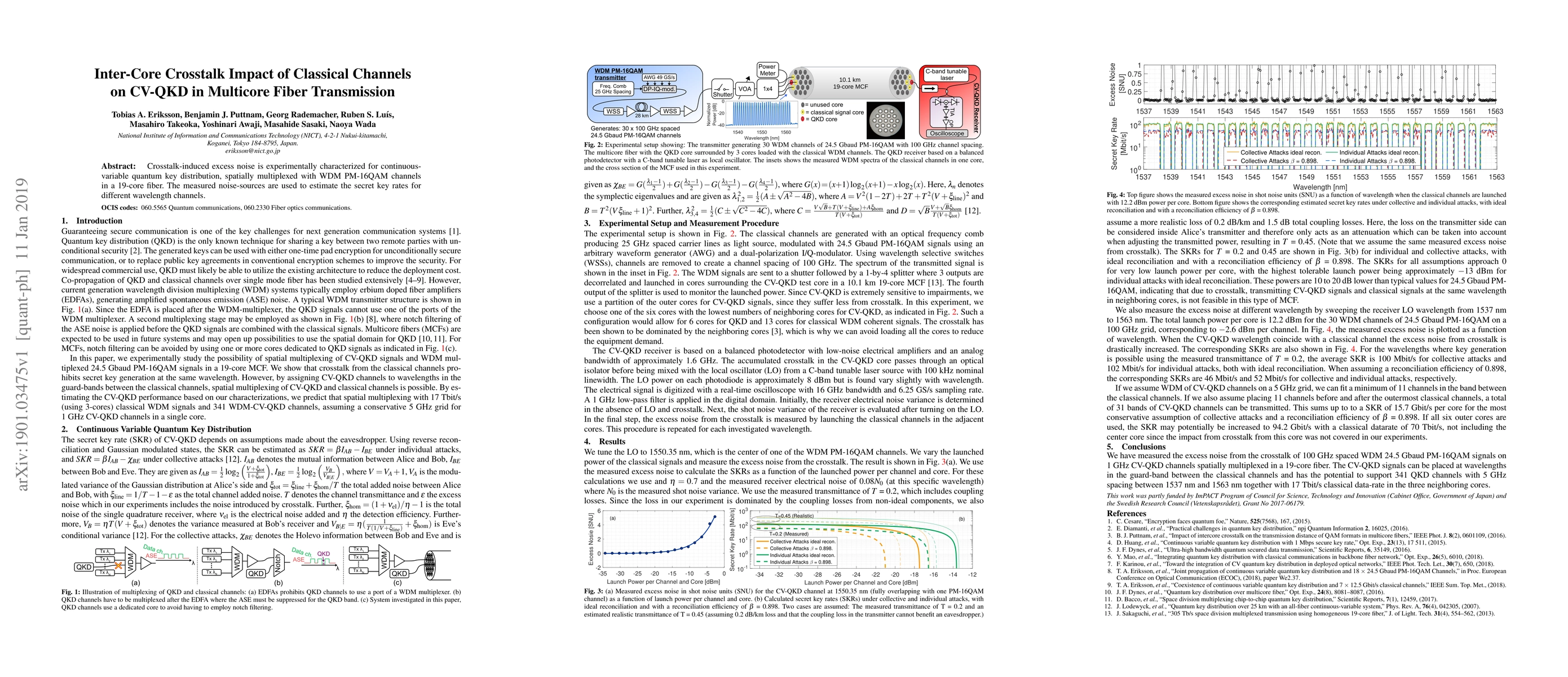 This paper experimentally characterizes crosstalk-induced noise in continuous-variable quantum key distribution (CV-QKD) over a 19-core fiber with wavelength-division multiplexing (WDM) PM-16QAM channels. The study estimates secret key rates for different channels based on the measured noise sources.