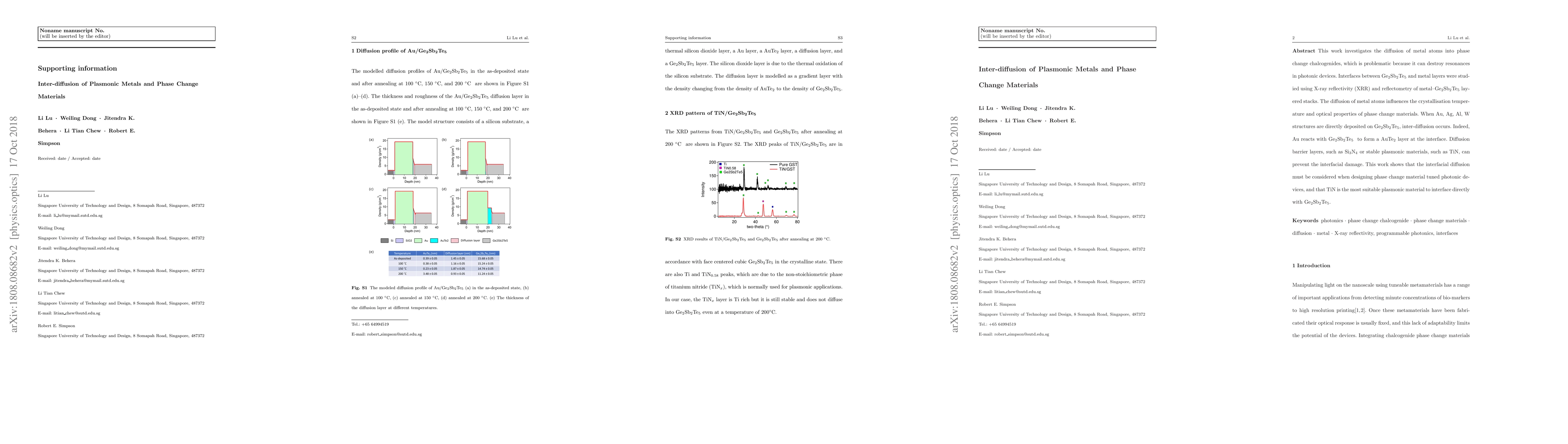 This study examines the diffusion of metal atoms into phase change materials, which disrupts photonic device resonances, and finds that TiN is the best plasmonic material to interface with Ge2Sb2Te5 without causing inter-diffusion damage. Diffusion barriers like Si3N4 or TiN can prevent this issue.