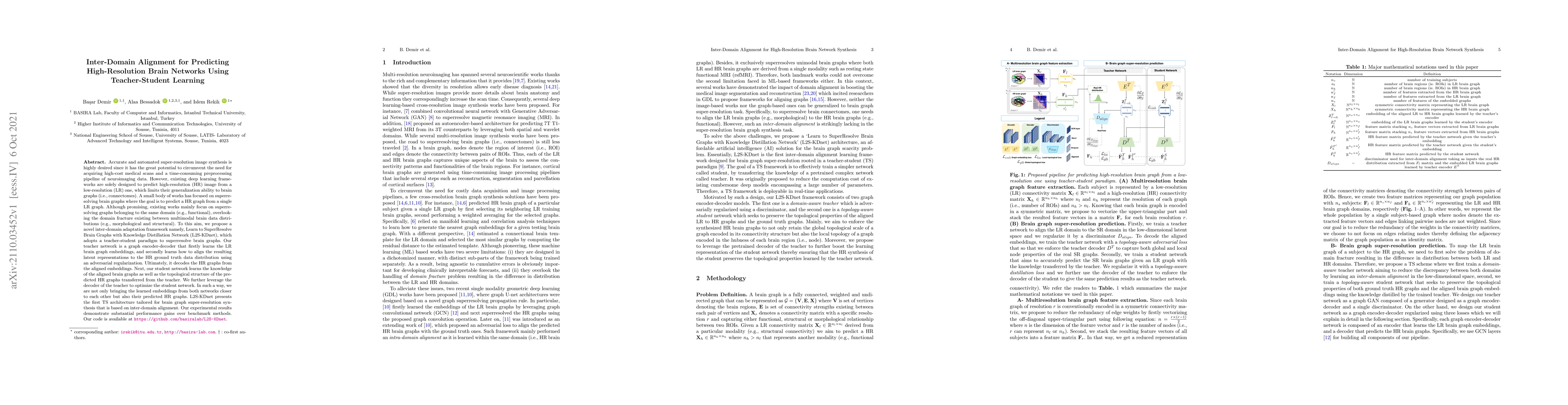 This paper proposes a novel inter-domain adaptation framework called L2S-KDnet for superresolving brain graphs using a teacher-student learning paradigm. The framework aims to predict high-resolution brain graphs from low-resolution inputs, addressing the domain fracture between multimodal brain data. Experimental results show significant performance improvements over existing methods.