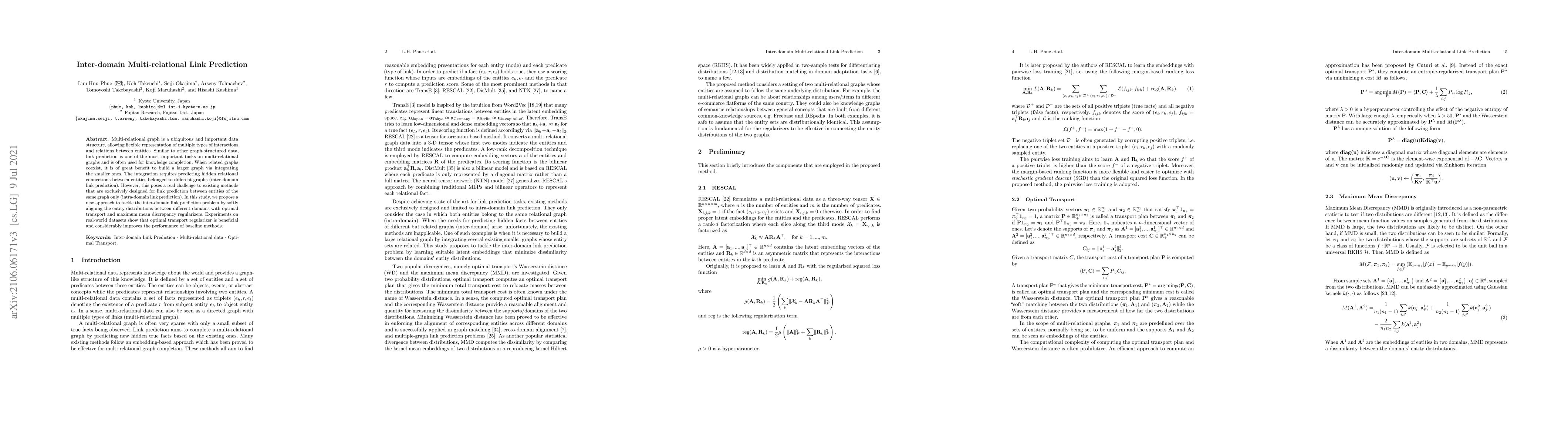 This paper proposes a novel approach for inter-domain multi-relational link prediction by aligning entity distributions across different graphs using optimal transport and maximum mean discrepancy regularizers. Experimental results demonstrate significant improvements over baseline methods, particularly with the optimal transport regularizer.