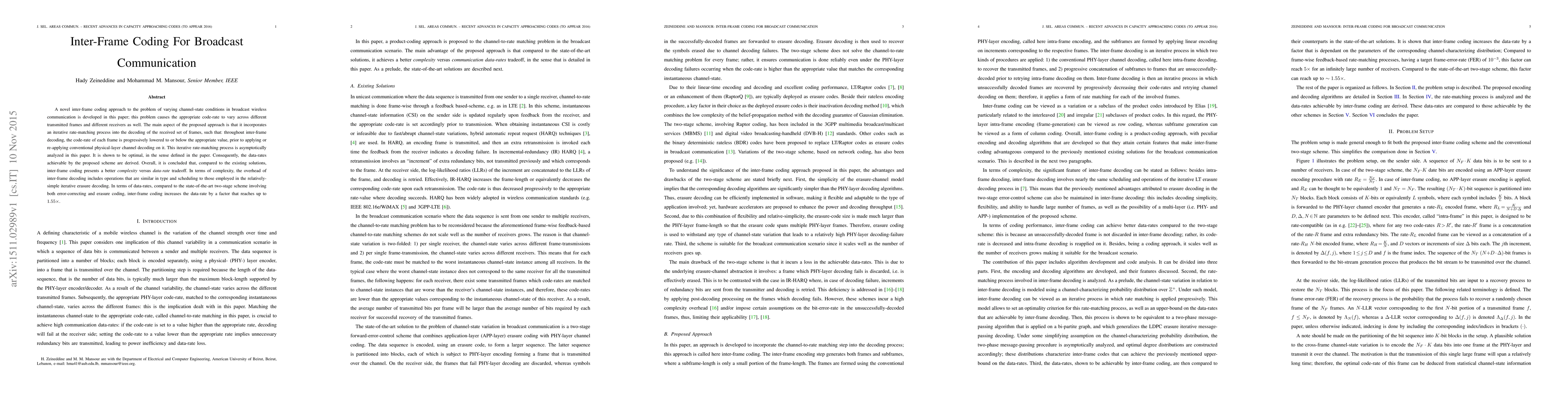 A novel inter-frame coding approach is developed to improve broadcast wireless communication under varying channel-state conditions. It achieves a better complexity versus data-rate tradeoff compared to existing solutions.