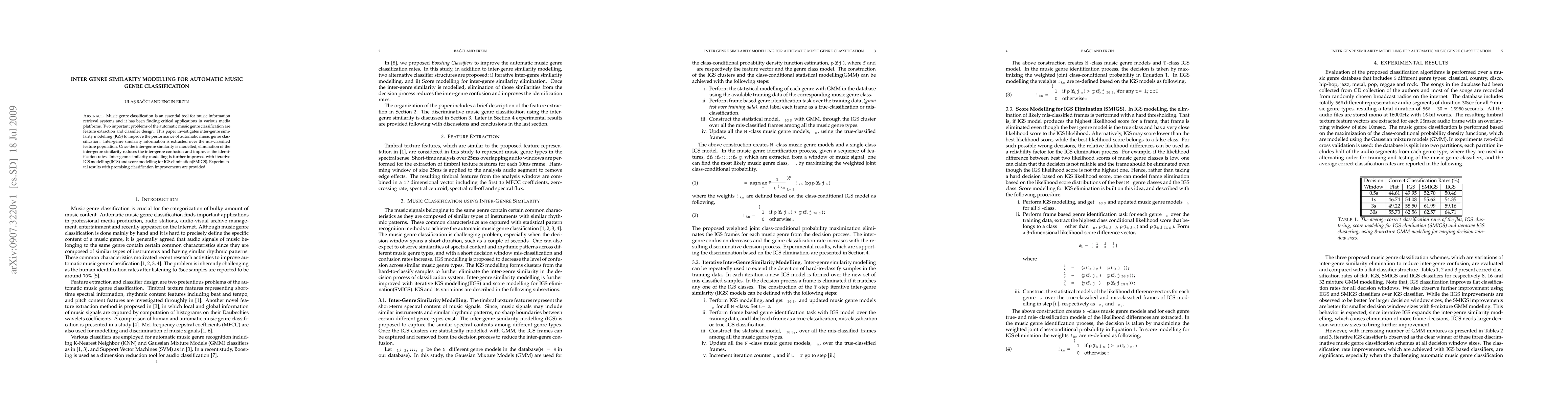 This paper explores inter-genre similarity modelling (IGS) to enhance automatic music genre classification, addressing feature extraction and classifier design through iterative IGS modelling and score modelling for IGS elimination, resulting in improved classification performance. Experimental results demonstrate significant improvements in identification rates.