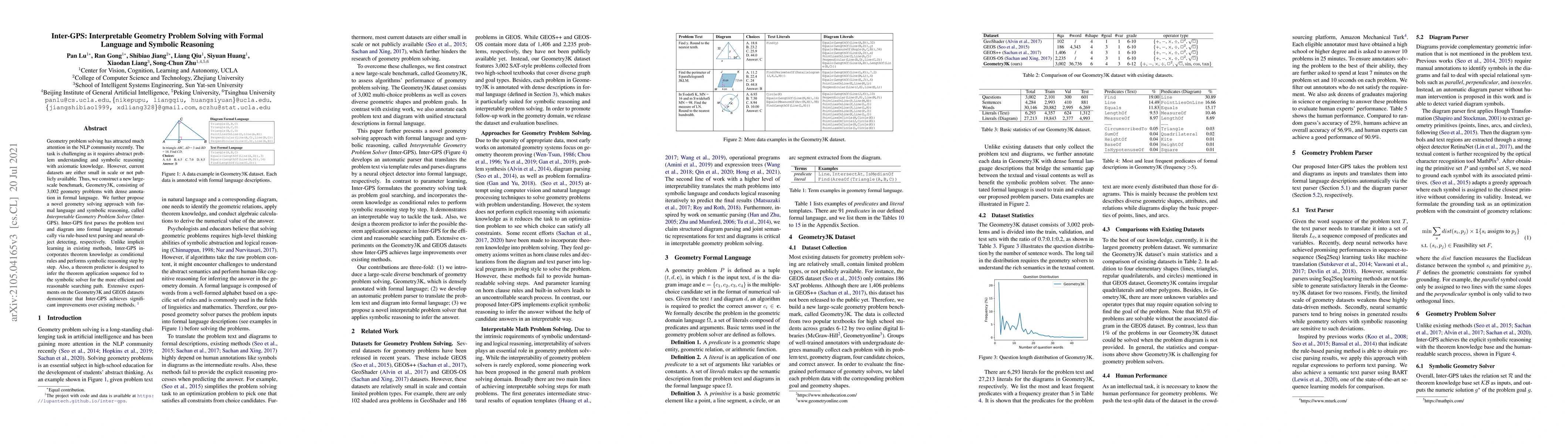 This paper introduces a new large-scale benchmark, Geometry3K, for geometry problem solving in NLP, and proposes Inter-GPS, a novel approach using formal language and symbolic reasoning. Inter-GPS parses problem texts and diagrams into formal language, incorporates theorem knowledge as conditional rules, and performs step-by-step symbolic reasoning, achieving significant improvements over existing methods.
