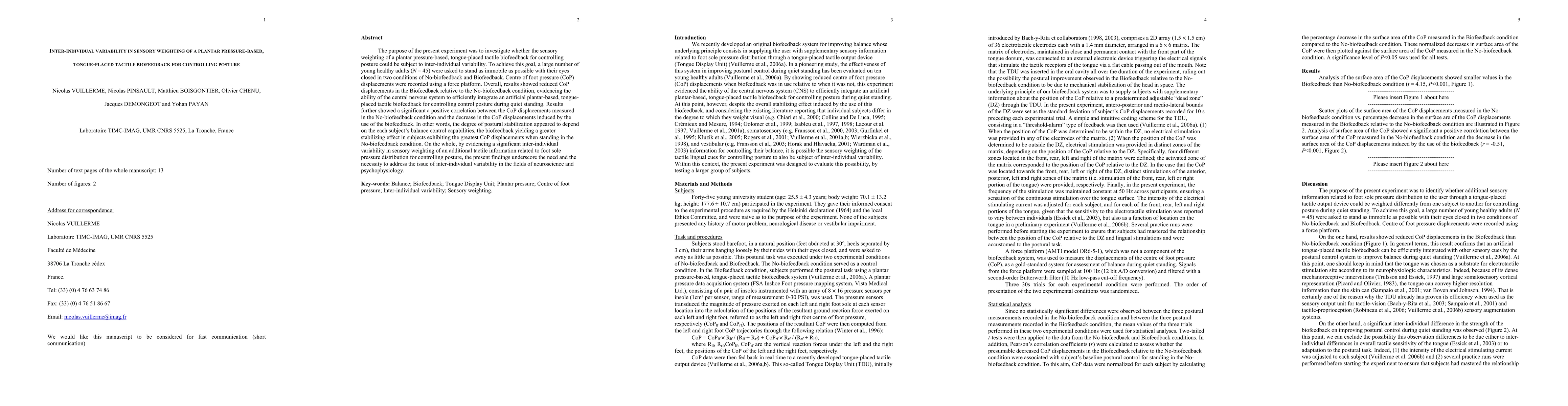 The purpose of the present experiment was to investigate whether the sensory weighting of a plantar pressure-based, tongue-placed tactile biofeedback for controlling posture could be subject to inter-individual variability. To achieve this goal, 60 young healthy adults were asked to stand as immobile as possible with their eyes closed in two conditions of No-biofeedback and Biofeedback. Centre of foot pressure (CoP) displacements were recorded using a force platform. Overall, results showed reduced CoP displacements in the Biofeedback relative to the No-biofeedback condition, evidencing the ability of the central nervous system to efficiently integrate an artificial plantar-based, tongue-placed tactile biofeedback for controlling posture during quiet standing. Results further showed a significant positive correlation between the CoP displacements measured in the No-biofeedback condition and the decrease in the CoP displacements induced by the use of the biofeedback. In other words, the degree of postural stabilization appeared to depend on each subject's balance control capabilities, the biofeedback yielding a greater stabilizing effect in subjects exhibiting the largest CoP displacements when standing in the No-biofeedback condition. On the whole, by evidencing a significant inter-individual variability in sensory weighting of an additional tactile information related to foot sole pressure distribution for controlling posture, the present findings underscore the need and the necessity to address the issue of inter-individual variability in the field of neuroscience.
