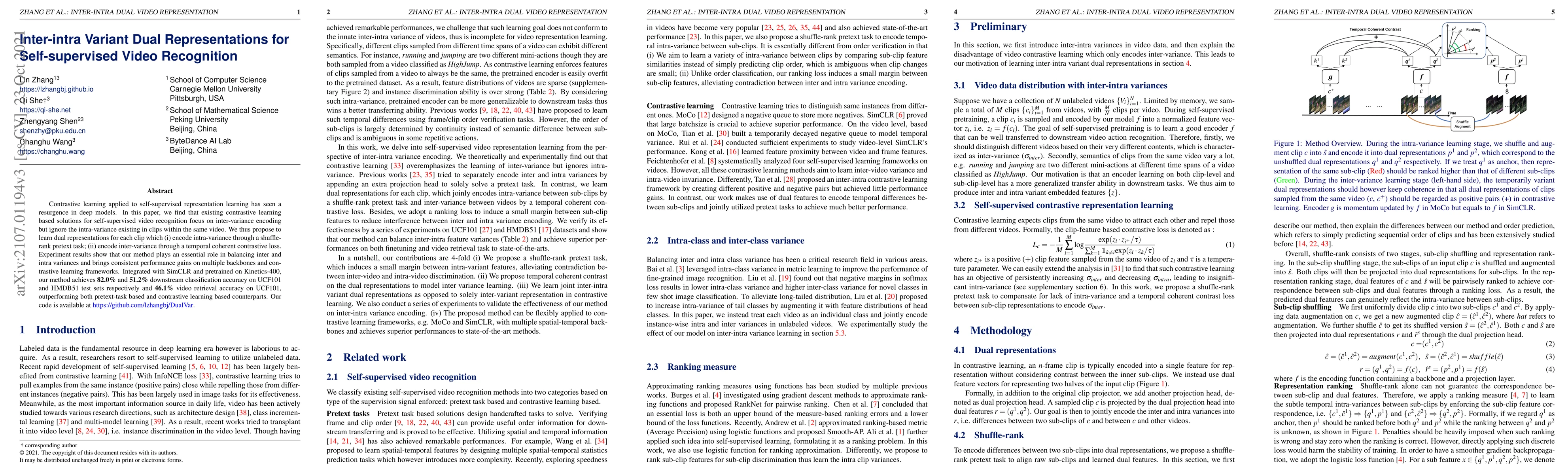This paper proposes a dual representation learning method for self-supervised video recognition that encodes both intra-variance via a shuffle-rank pretext task and inter-variance through a temporal contrastive loss. The method achieves superior performance on UCF101, HMDB51, and video retrieval tasks, demonstrating the importance of balancing inter and intra variances.