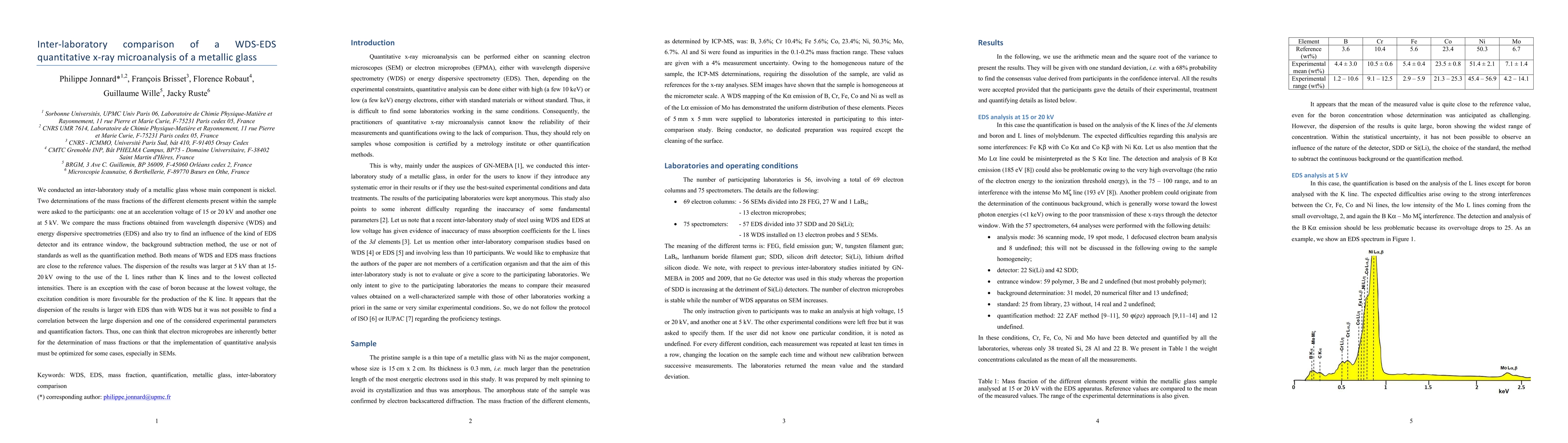 We conducted an inter-laboratory study of a metallic glass whose main component is nickel. Two determinations of the mass fractions of the different elements present within the sample were asked to the participants: one at an acceleration voltage of 15 or 20 kV and another one at 5 kV. We compare the mass fractions obtained from wavelength dispersive (WDS) and energy dispersive spectrometries (EDS) and also try to find an influence of the kind of EDS detector and its entrance window, the background subtraction method, the use or not of standards as well as the quantification method. Both means of WDS and EDS mass fractions are close to the reference values. The dispersion of the results was larger at 5 kV than at 15-20 kV owing to the use of the L lines rather than K lines and to the lowest collected intensities. There is an exception with the case of boron because at the lowest voltage, the excitation condition is more favourable for the production of the K line. It appears that the dispersion of the results is larger with EDS than with WDS but it was not possible to find a correlation between the large dispersion and one of the considered experimental parameters and quantification factors. Thus, one can think that electron microprobes are inherently better for the determination of mass fractions or that the implementation of quantitative analysis must be optimized for some cases, especially in SEMs.