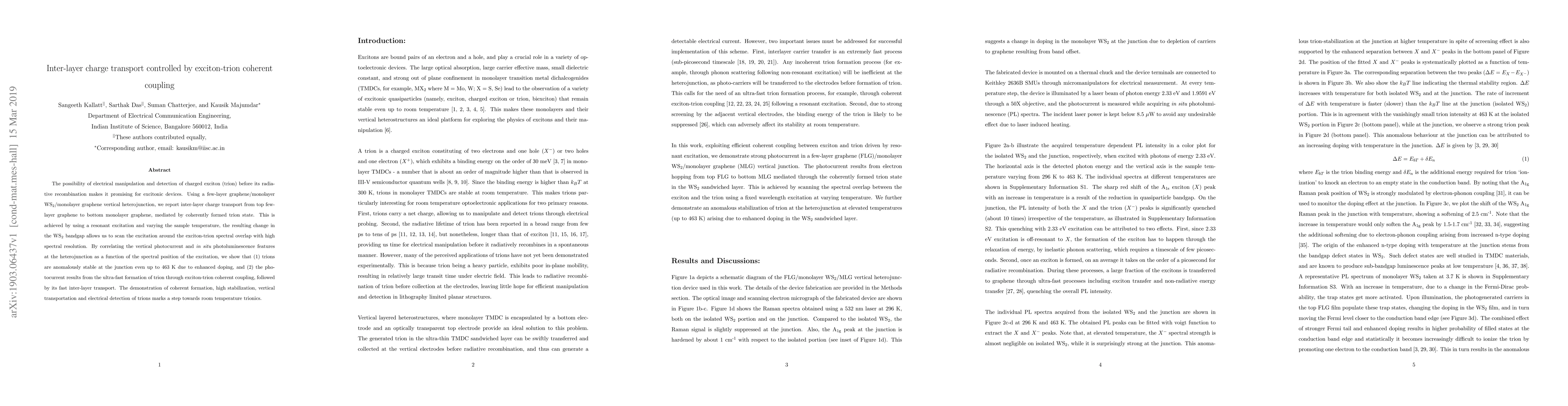 This paper demonstrates inter-layer charge transport via coherent exciton-trion coupling in a graphene/WS$_{2}$/graphene heterojunction. Trions are shown to be stable and rapidly transported, paving the way for room temperature trionic devices.