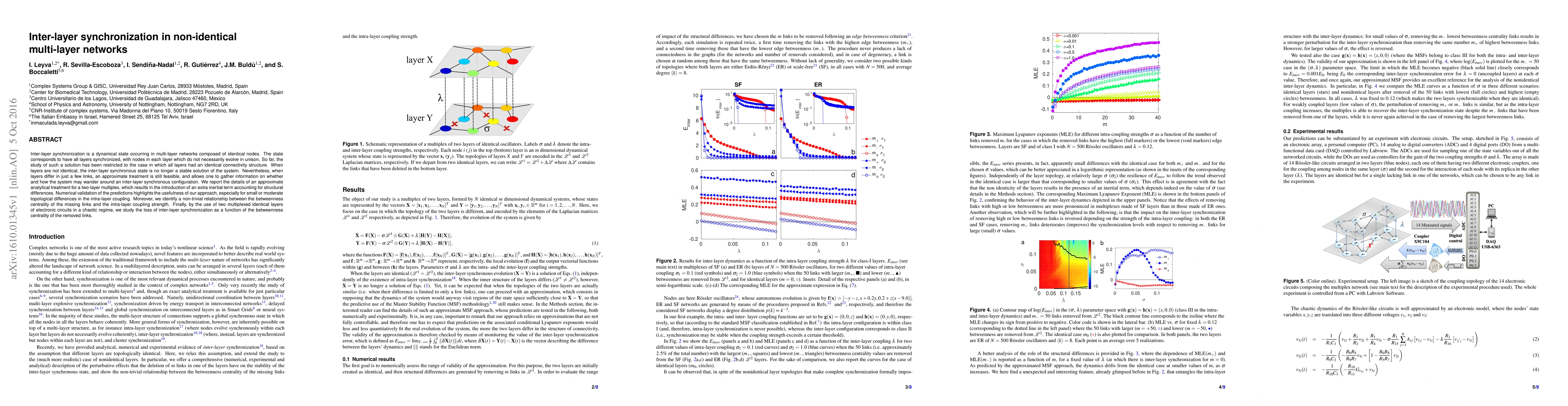 This paper investigates inter-layer synchronization in non-identical multi-layer networks, proposing an approximate analytical treatment for a two-layer system with minor structural differences. The study identifies a relationship between the centrality of removed links and synchronization loss, validated through both theoretical predictions and experimental electronic circuits.