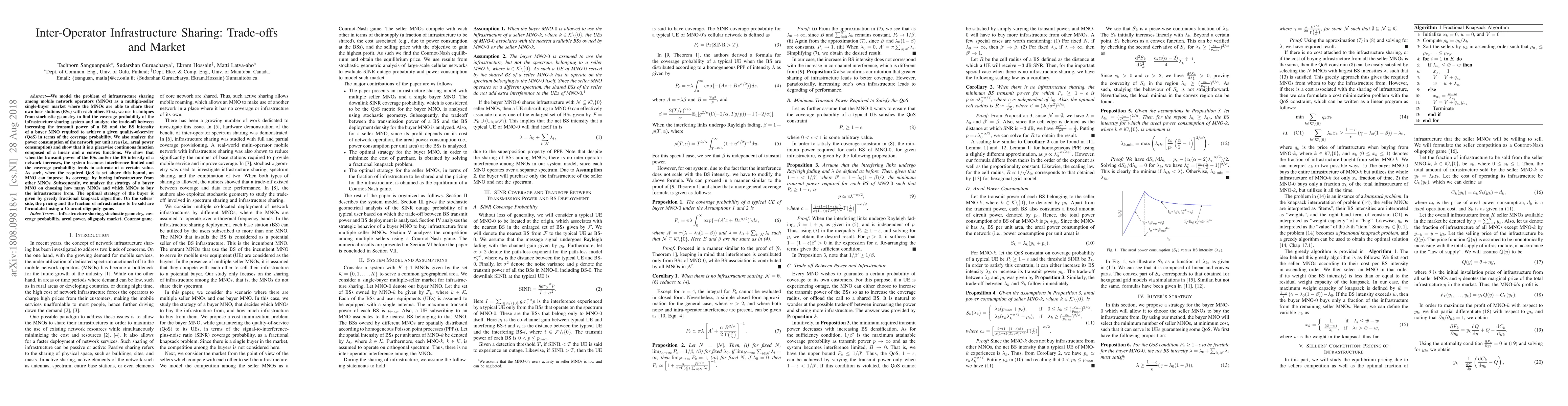 This paper models mobile network operator (MNO) infrastructure sharing as a multiple-seller single-buyer market, analyzing coverage probability and trade-offs between transmit power and base station intensity. It finds that increased power and station density lead to interference-limited saturation, suggesting MNOs can improve coverage by purchasing infrastructure from others, with optimal strategies derived from a greedy fractional knapsack algorithm.