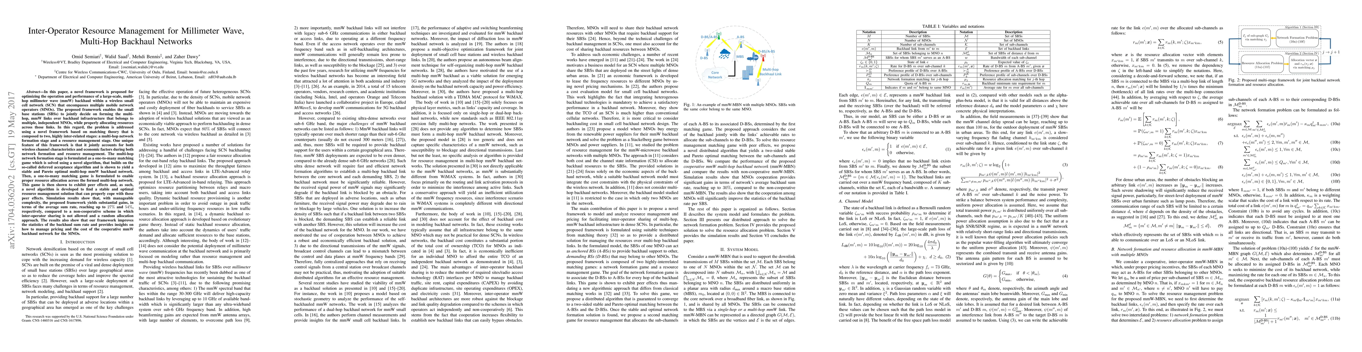 This paper proposes a novel framework for optimizing multi-hop millimeter wave backhaul networks in wireless small cell networks involving multiple operators. It uses matching theory to form stable, Pareto optimal networks and allocate resources, achieving up to 54% higher average sum rate compared to non-cooperative schemes.
