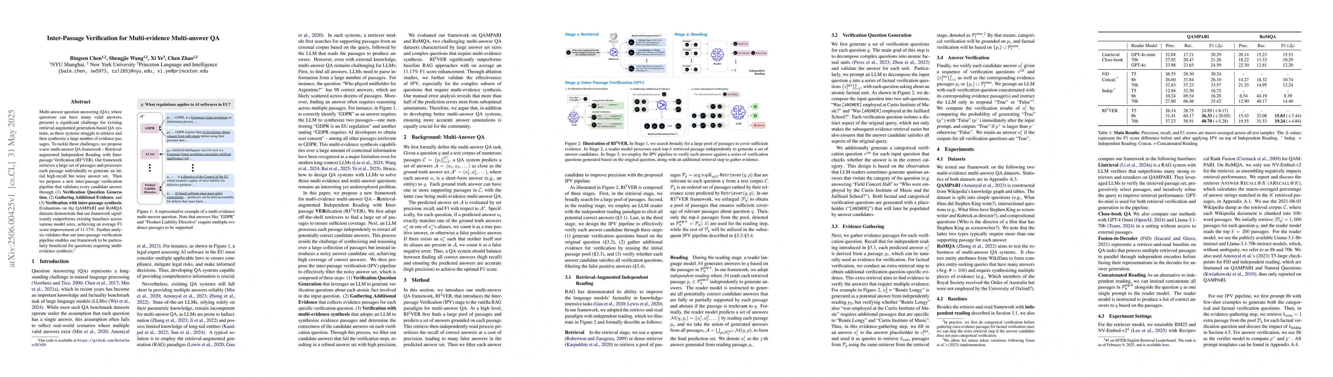 The paper proposes a multi-answer QA framework, RI2VER, which retrieves a broad set of passages, processes each independently to generate an initial answer set, and then refines the prediction set using the IPV pipeline to gather inter-passage evidence for verification with an LLM.