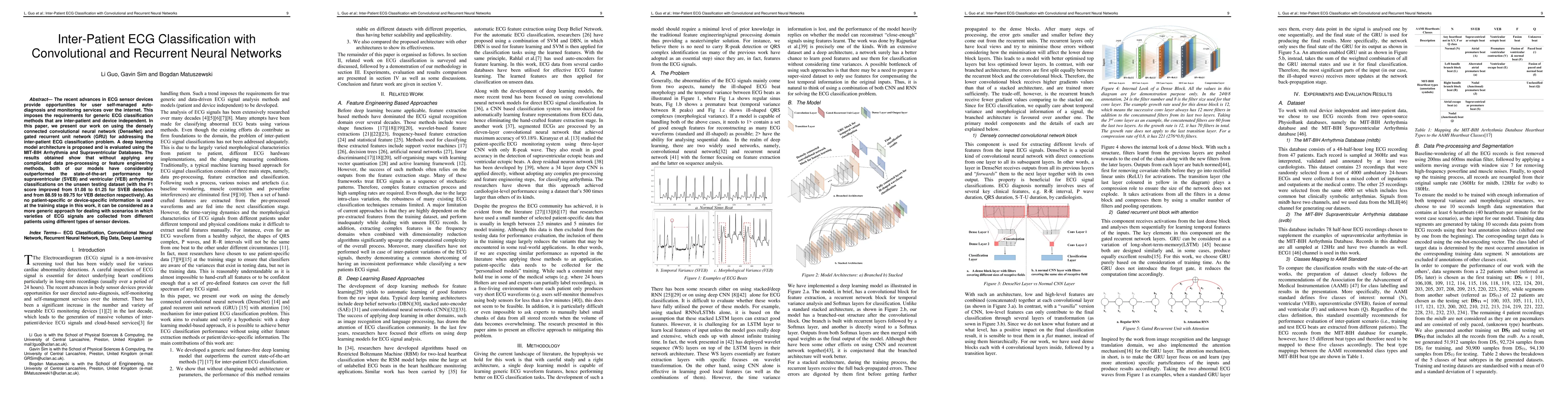 This paper proposes a deep learning model using DenseNet and GRU for inter-patient ECG classification, achieving superior performance on the MIT-BIH Arrhythmia Database without patient-specific or device-specific data, outperforming state-of-the-art methods in supraventricular and ventricular arrhythmia detection.