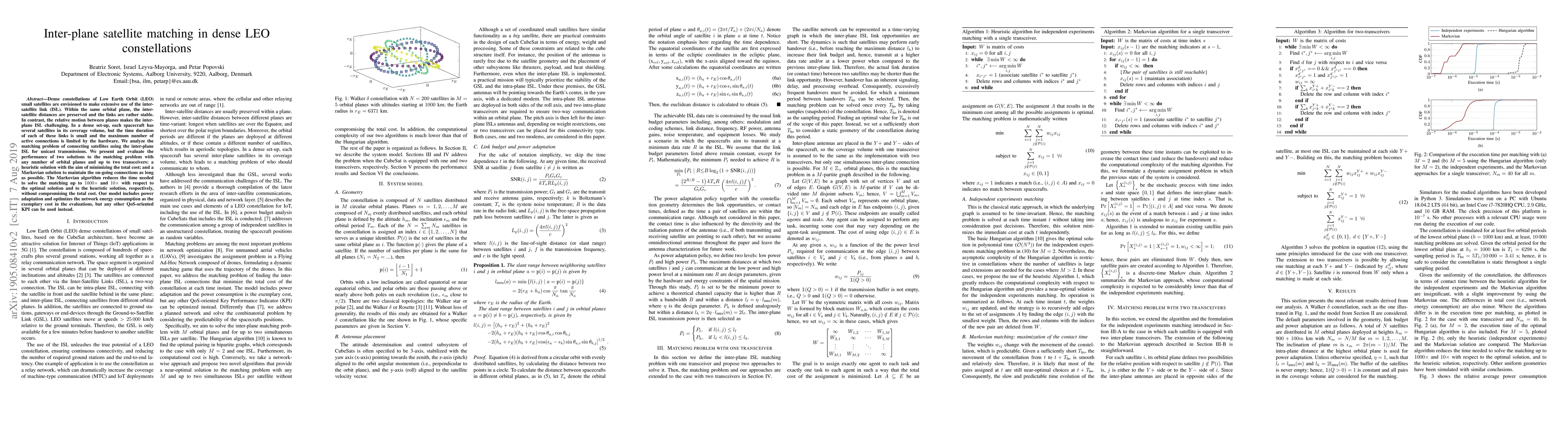 This paper investigates the inter-plane satellite matching problem in dense Low Earth Orbit constellations, proposing two solutions: a heuristic approach to minimize cost and a Markovian algorithm to prolong connection durations. The Markovian solution significantly reduces computation time without affecting total cost, optimizing network energy consumption.