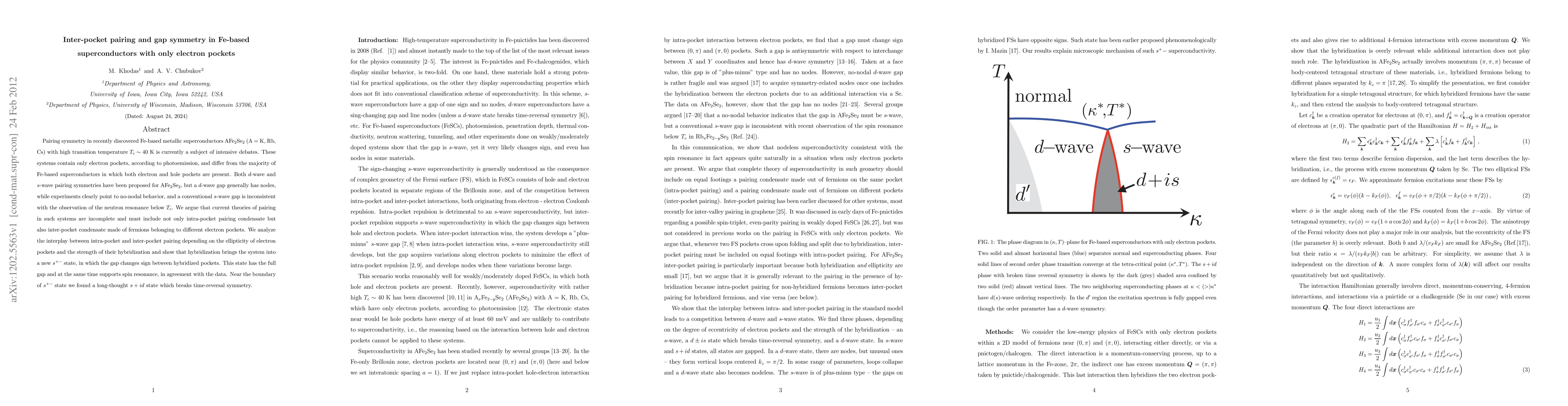 The paper discusses the pairing symmetry in electron-only Fe-based superconductors like AFe$_2$Se$_2$, proposing that neither d-wave nor conventional s-wave pairing fully explains experimental observations. It suggests an $s^{+-}$ pairing state resulting from inter-pocket condensates, which has a full gap and supports spin resonance, consistent with observed data.