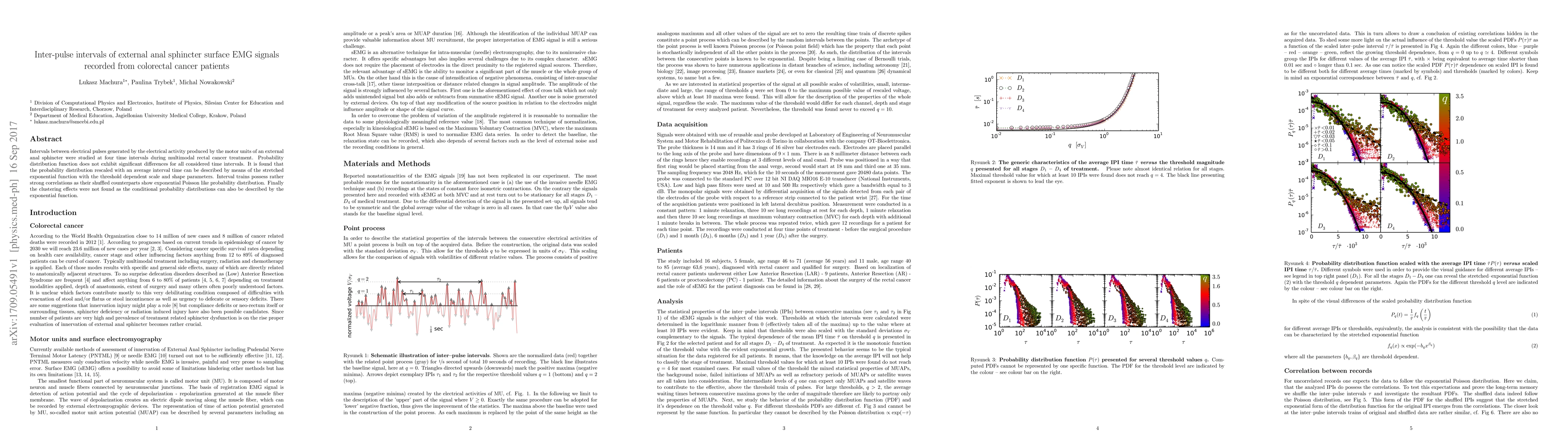 This study examines electrical signals from the external anal sphincter in colorectal cancer patients undergoing treatment, finding that the intervals between these signals follow a stretched exponential distribution, with strong correlations but no clustering effects observed.