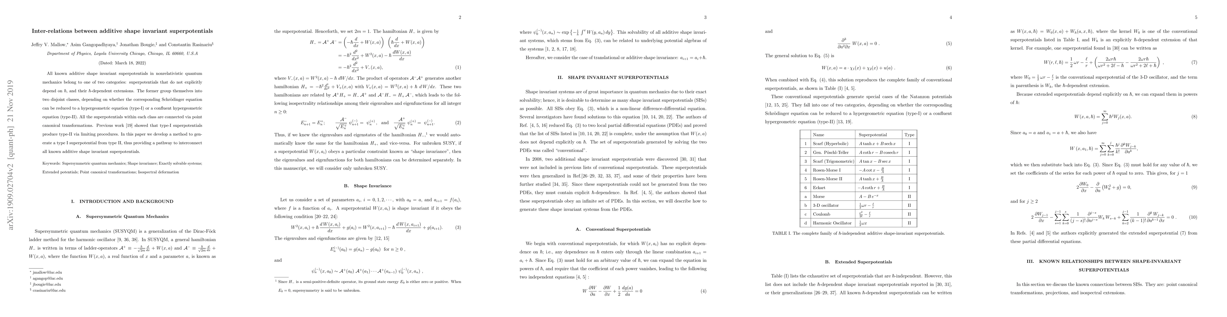 All known additive shape invariant superpotentials in nonrelativistic quantum mechanics belong to one of two categories: superpotentials that do not explicitly depend on $\hbar$, and their $\hbar$-dependent extensions. The former group themselves into two disjoint classes, depending on whether the corresponding Schr\"odinger equation can be reduced to a hypergeometric equation (type-I) or a confluent hypergeometric equation (type-II). All the superpotentials within each class are connected via point canonical transformations. Previous work showed that type-I superpotentials produce type-II via limiting procedures. In this paper we develop a method to generate a type I superpotential from type II, thus providing a pathway to interconnect all known additive shape invariant superpotentials.