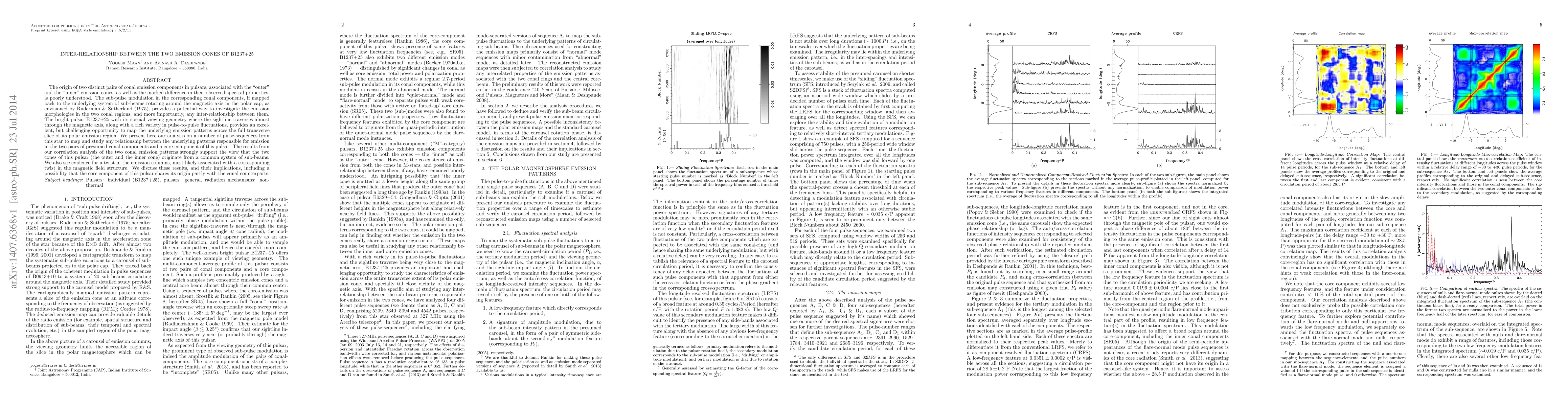 The origin of two distinct pairs of conal emission components in pulsars, associated with the "outer" and the "inner" emission cones, as well as the marked difference in their observed spectral properties, is poorly understood. The sub-pulse modulation in the corresponding conal components, if mapped back to the underlying system of sub-beams rotating around the magnetic axis in the polar cap, as envisioned by Ruderman & Sutherland (1975), provides a potential way to investigate the emission morphologies in the two conal regions, and more importantly, any inter-relationship between them. The bright pulsar B1237+25 with its special viewing geometry where the sightline traverses almost through the magnetic axis, along with a rich variety in pulse-to-pulse fluctuations, provides an excellent, but challenging opportunity to map the underlying emission patterns across the full transverse slice of its polar emission region. We present here our analysis on a number of pulse-sequences from this star to map and study any relationship between the underlying patterns responsible for emission in the two pairs of presumed conal-components and a core-component of this pulsar. The results from our correlation analysis of the two conal emission patterns strongly support the view that the two cones of this pulsar (the outer and the inner cone) originate from a common system of sub-beams. We also see evidence for a twist in the emission columns, most likely associated with a corresponding twist in the magnetic field structure. We discuss these results, and their implications, including a possibility that the core component of this pulsar shares its origin partly with the conal counterparts.