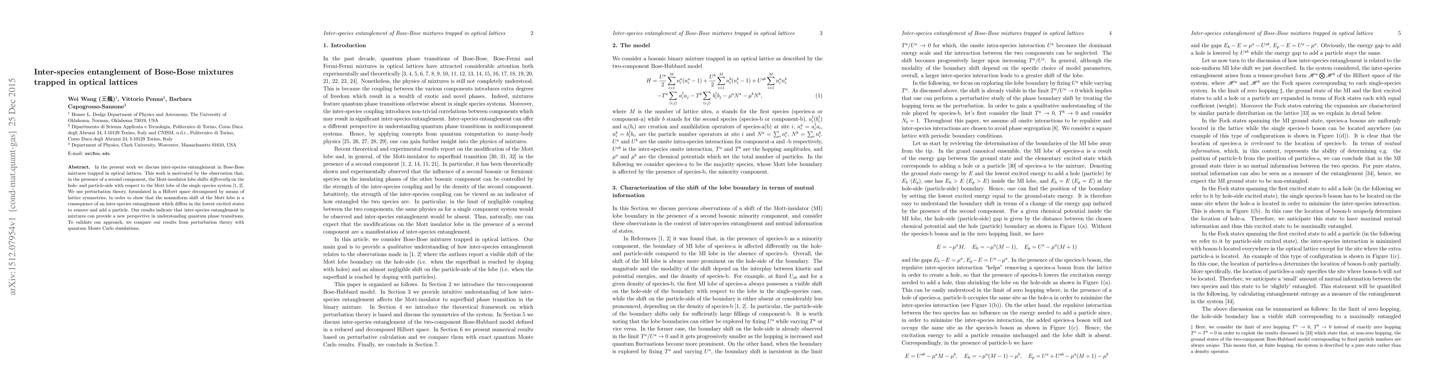In the present work we discuss inter-species entanglement in Bose-Bose mixtures trapped in optical lattices. This work is motivated by the observation that, in the presence of a second component, the Mott-insulator lobe shifts {\em{differently}} on the hole- and particle-side with respect to the Mott lobe of the single species system (Phys. Rev. A 82, 021601, Laser Phys. 21, 1443). We use perturbation theory, formulated in a Hilbert space decomposed by means of lattice symmetries, in order to show that the nonuniform shift of the Mott lobe is a consequence of an inter-species entanglement which differs in the lowest excited states to remove and add a particle. Our results indicate that inter-species entanglement in mixtures can provide a new perspective in understanding quantum phase transitions. To validate our approach, we compare our results from perturbation theory with quantum Monte Carlo simulations.