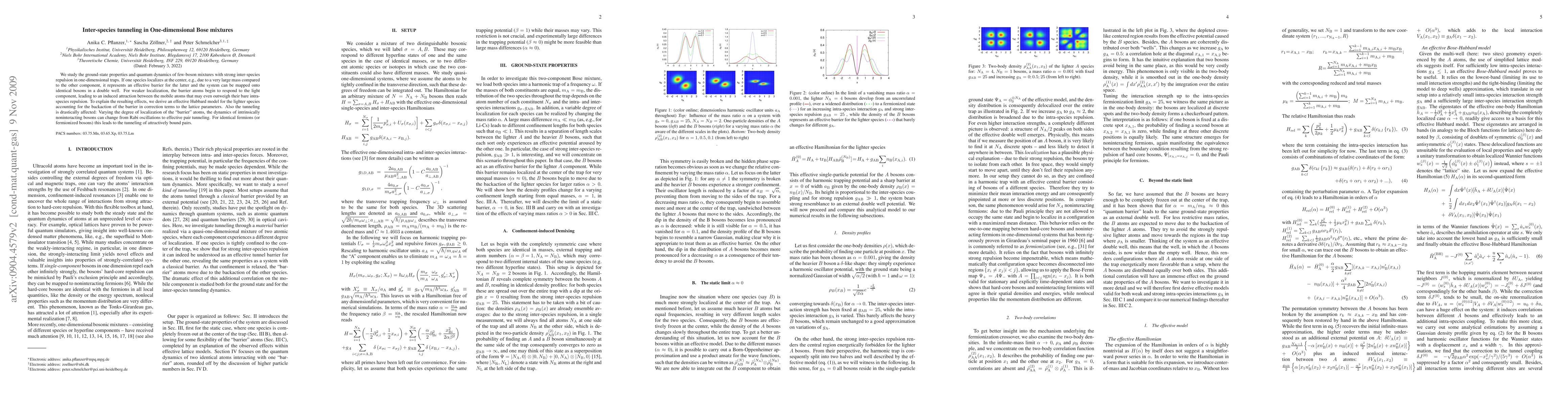 Researchers study the behavior of two types of bosons in a one-dimensional trap with strong repulsion, finding that the lighter boson can tunnel through the heavier boson, even if initially repelled, leading to complex dynamics.